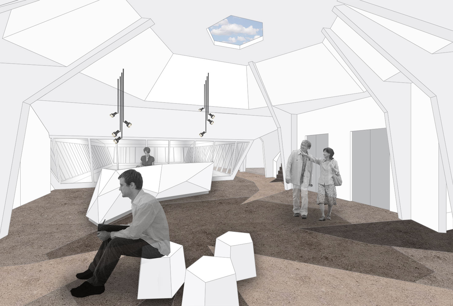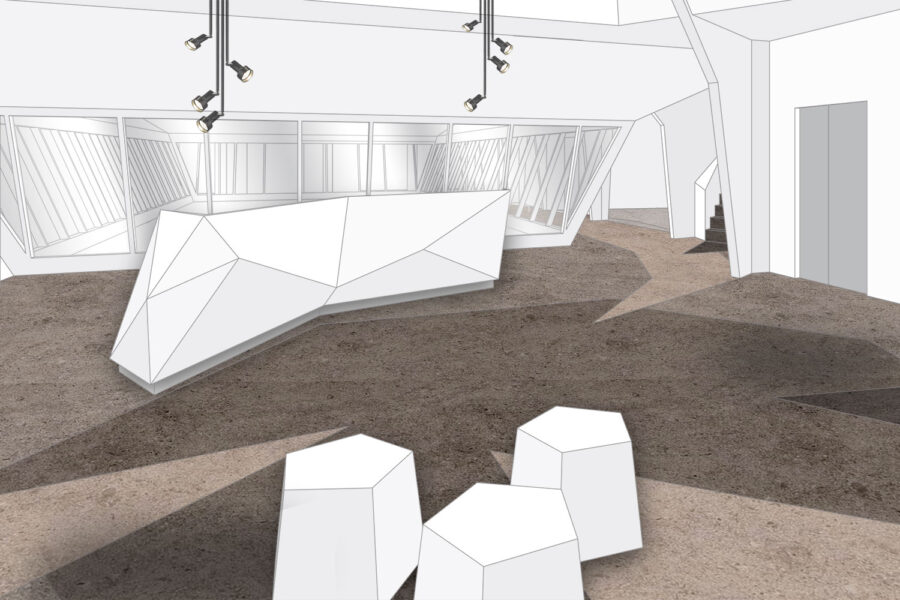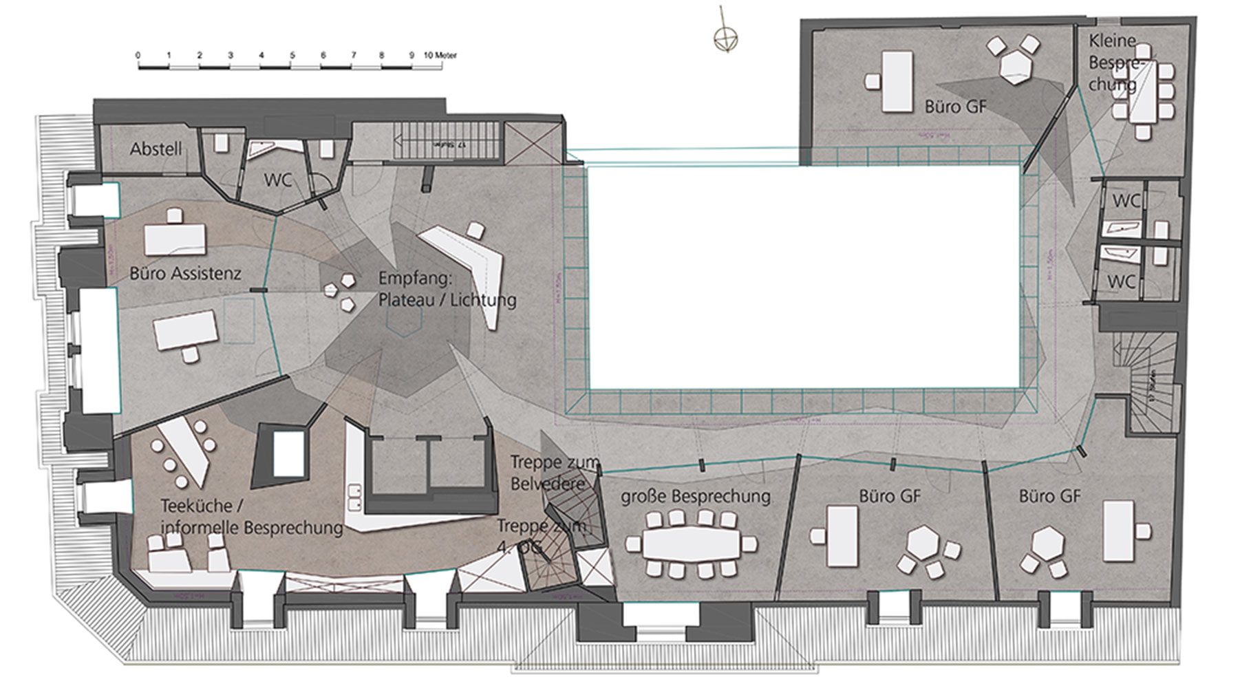 Die lichte Glasfassade zum Innenhof rückten wir in den Mittelpunkt. Durch die Anordnung der Wege um den Lichthof herum wird dieser von allen Seiten erlebbar. Um den Räumen trotz Dachschrägen eine angenehme Form zu geben, haben wir Stützen in Formen verwandelt die den Raum optisch vervollständigen.