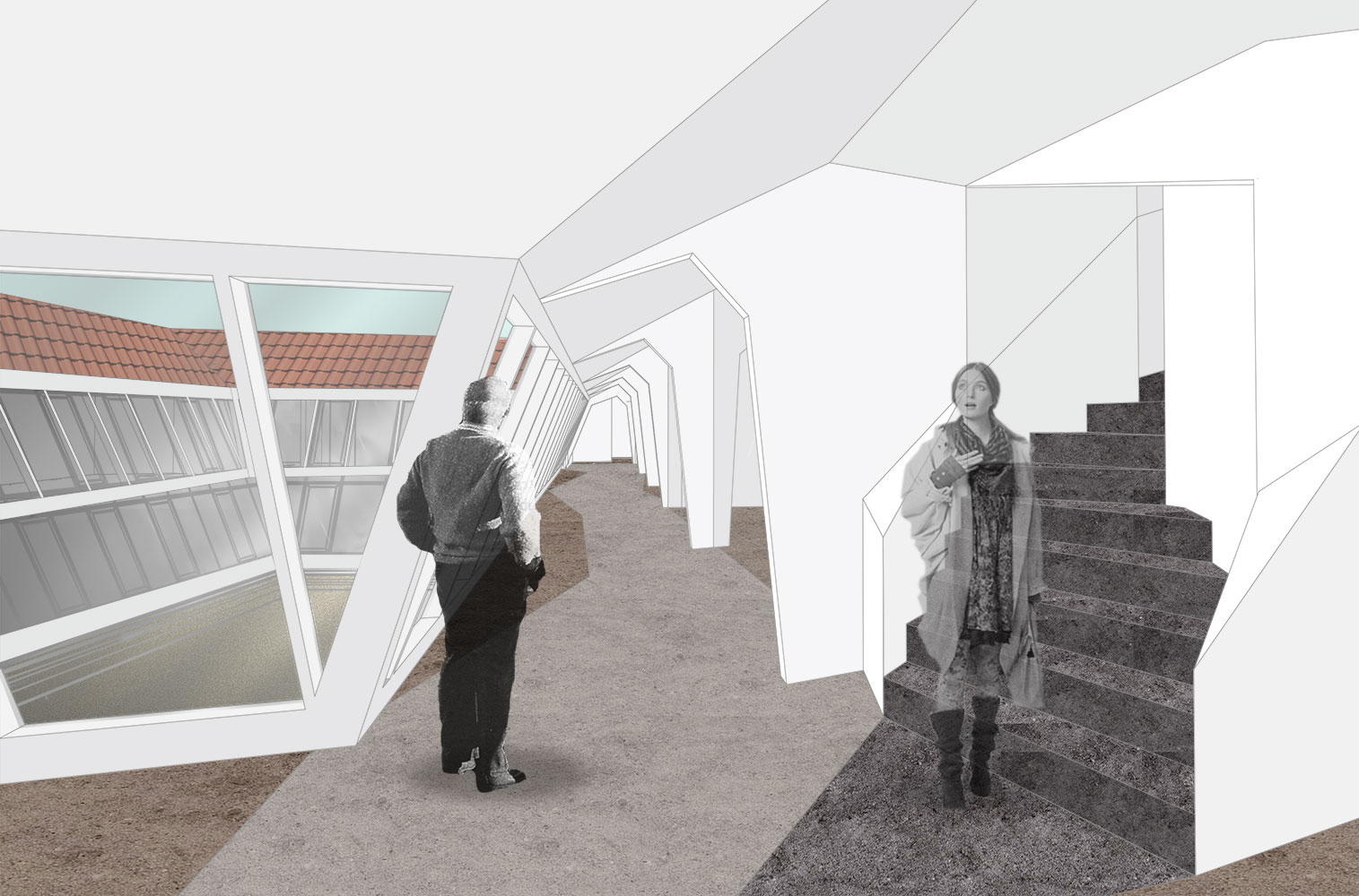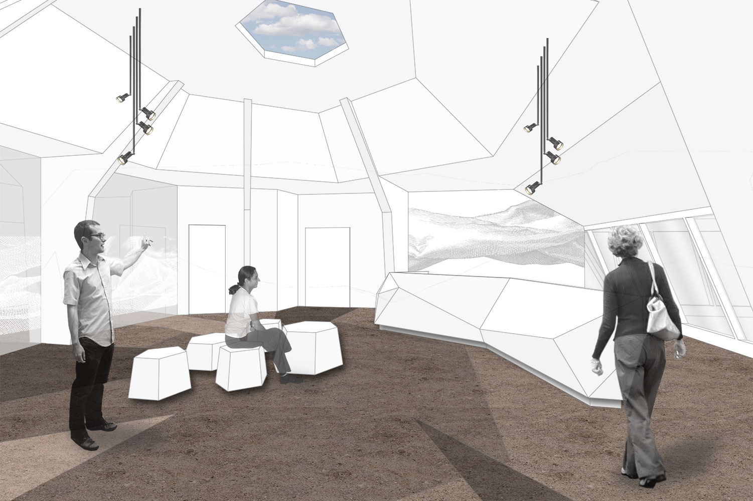 Im aufgesetzten Dachgeschoss eines denkmalgeschützten Hauses sollte eine Bürolandschaft entstehen. Dafür interpretierten wir typische Kenzeichen des Barock (dynamische Formen, bewegte Fassaden) auf moderne Art und Weise.