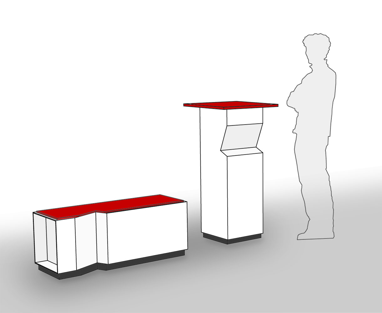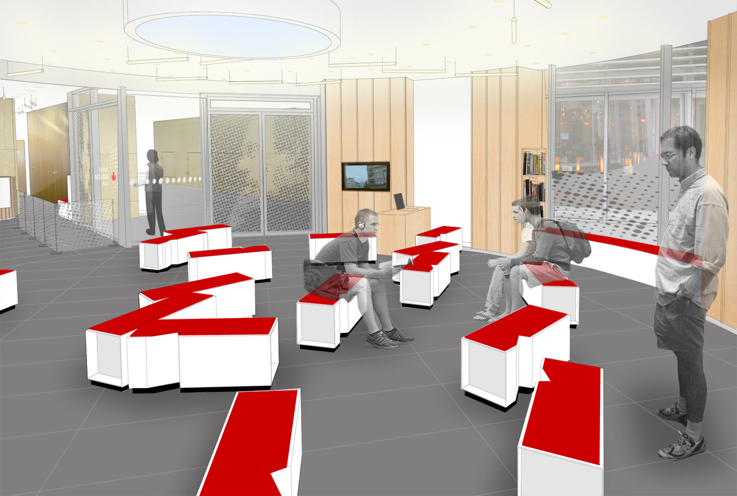 Der Marshall-McLuhan-Salon ist für die Kanadische Botschaft der Schnittpunkt zur Öffentlichkeit, wo Wissen über das moderne Kanada vermittelt wird. Das Leitthema unserer Umgestaltung war das Holzflößen. Dies wird unter Einbeziehung der Flaggenfarben Rot und Weiß mittels flexiblem Mobiliar dargestellt: Möbelquader dienen als Sitzbänke, Stehtische und Informationsträger und verteilen sich wie eine fließende Masse in den Räumen. Eine Kerbe symbolisiert einen Axthieb oder eine Zacke des kanadischen Ahornblatts.