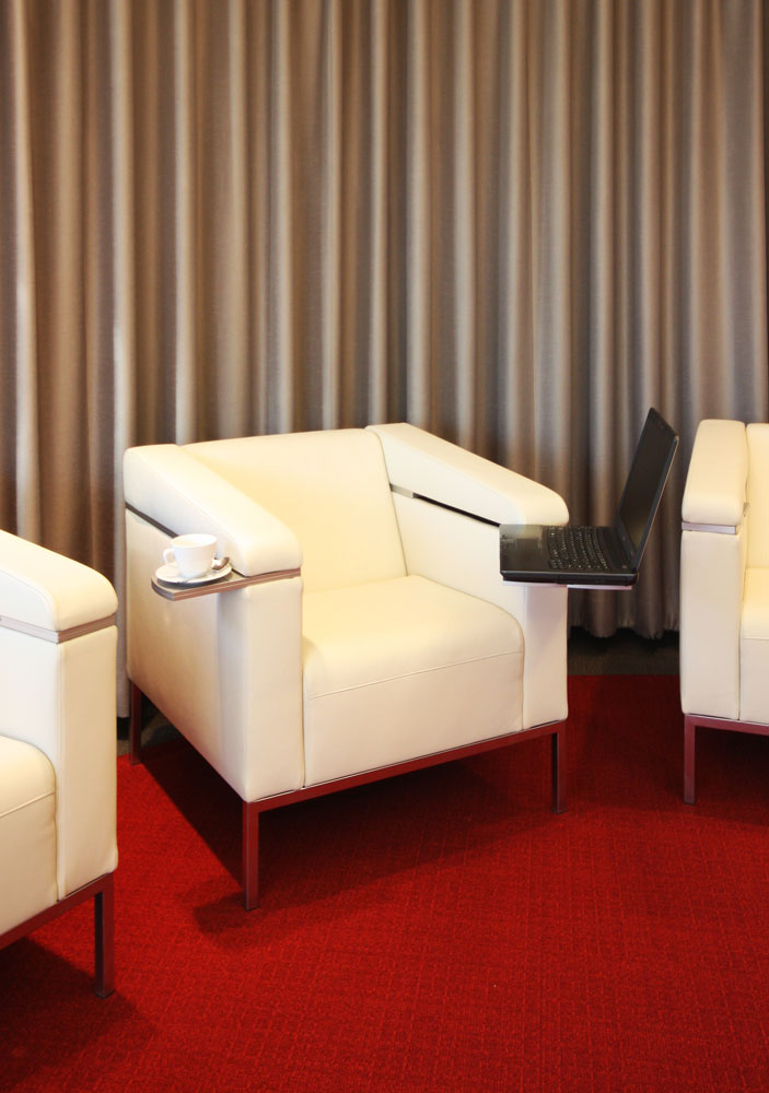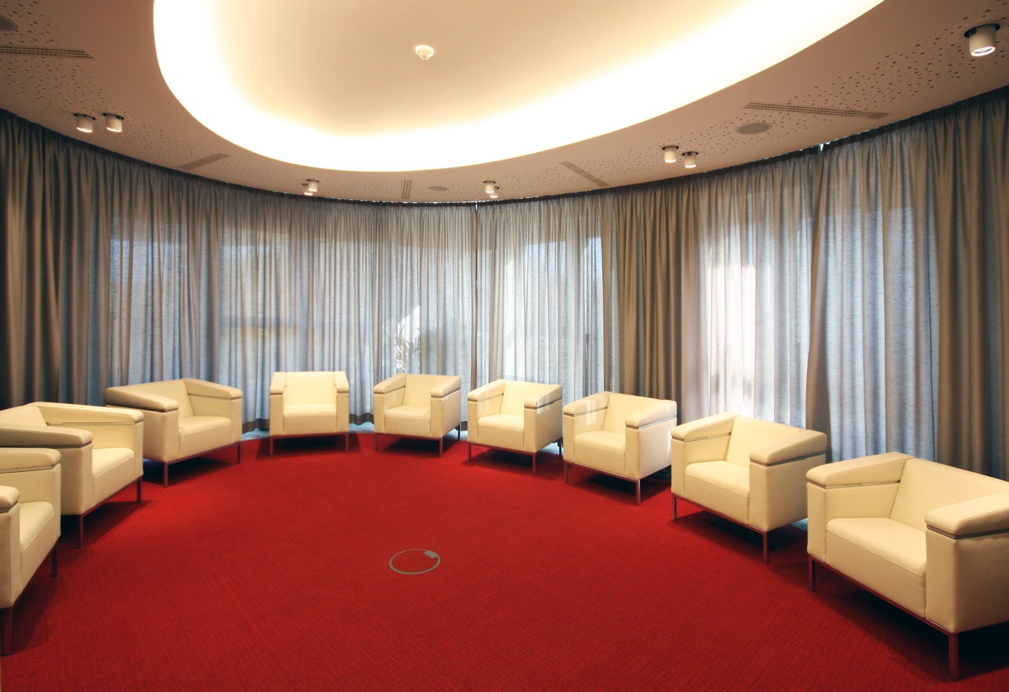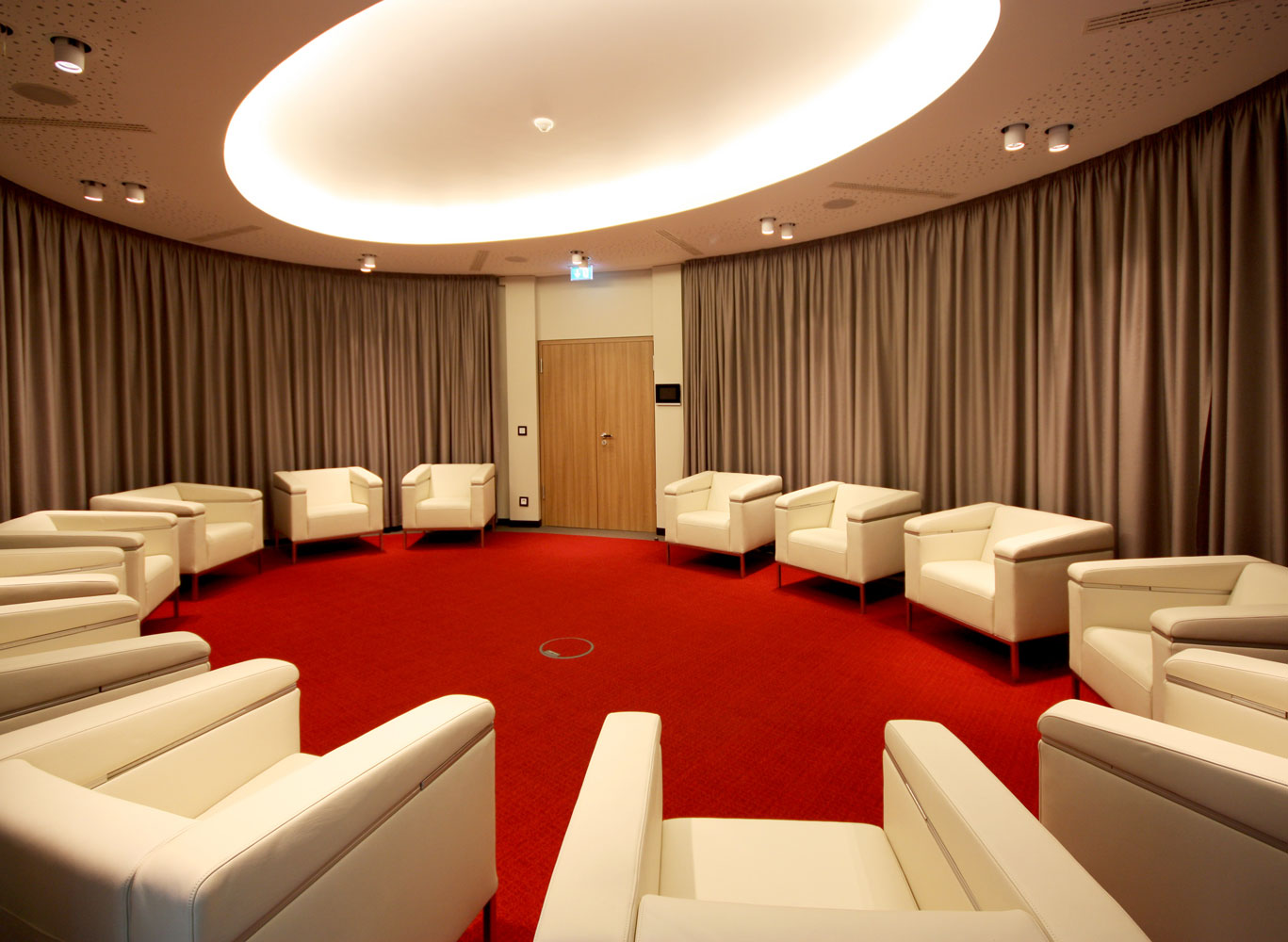 Das Zentrum der Akademie ist die ovale VIP-Lounge für wichtige Verhandlungsgespräche und Diskussionen. Die exklusive Atmosphäre wurde farblich, akustisch und lichttechnisch optimal geplant. Die hochwertigen Sessel bieten einen Stromanschluss und Ablageflächen für Notebook und Getränke. Der umlaufende Vorhang ermöglicht wahlweise den offenen Ausblick oder Abgeschlossenheit und höchstmögliche Konzentration auf die Gesprächsrunde. Auf Kommunikationsbarrieren wie Tische oder feste Monitore wurde bewusst verzichtet.