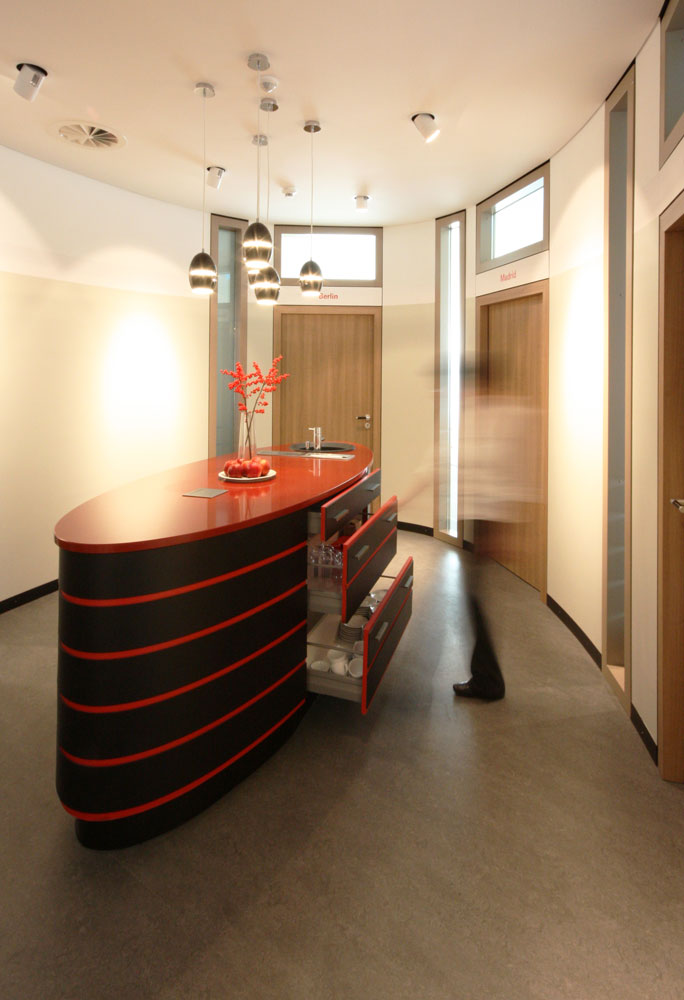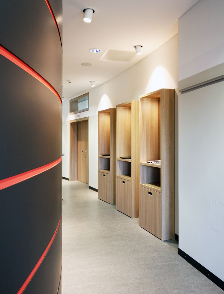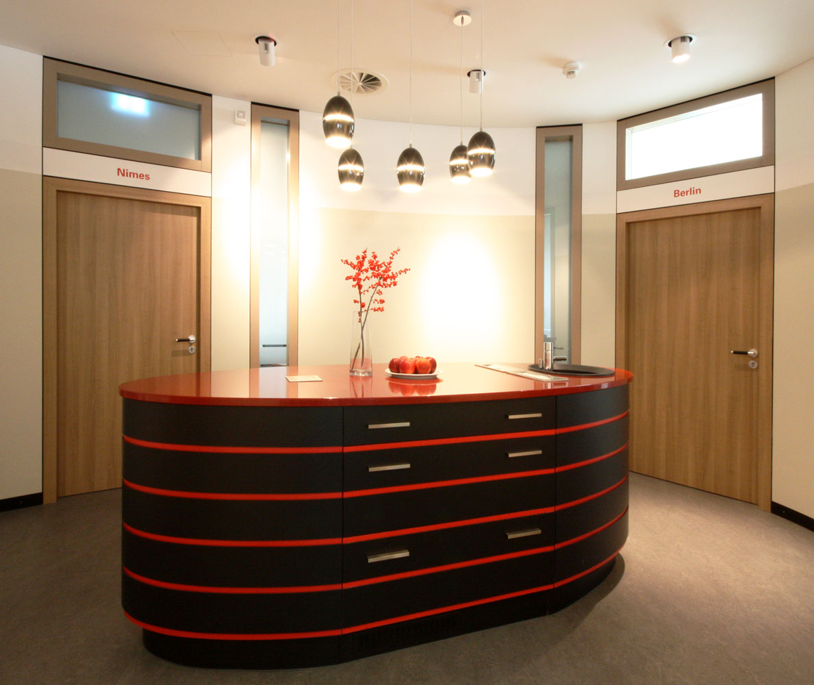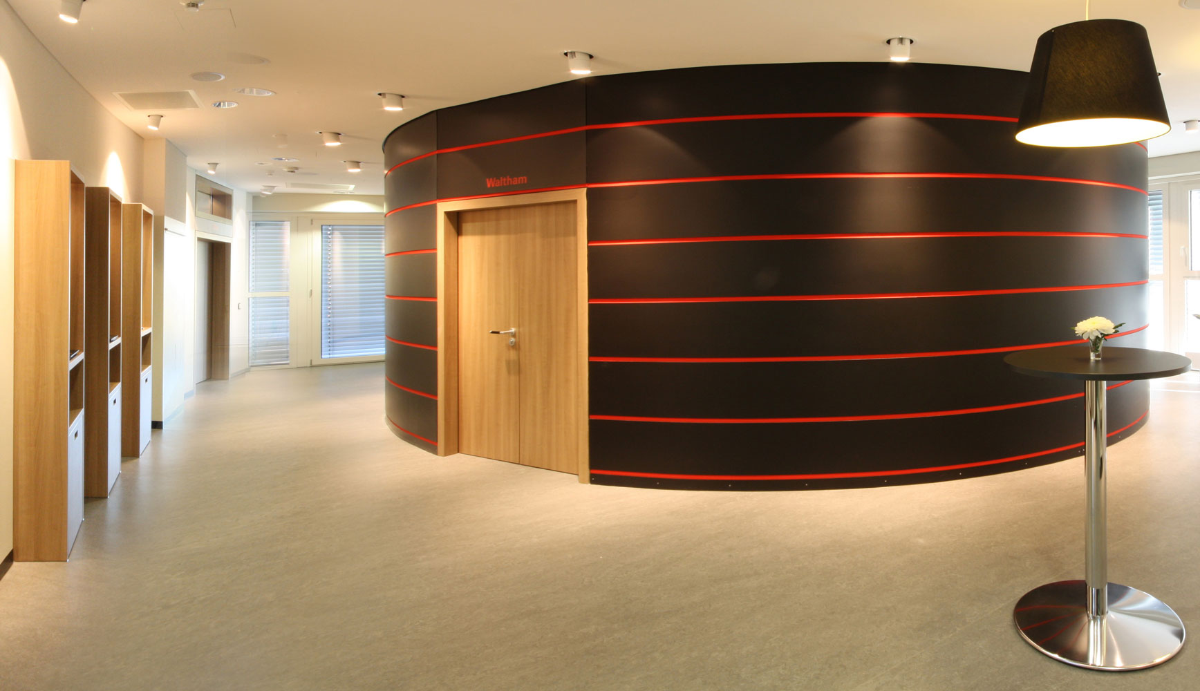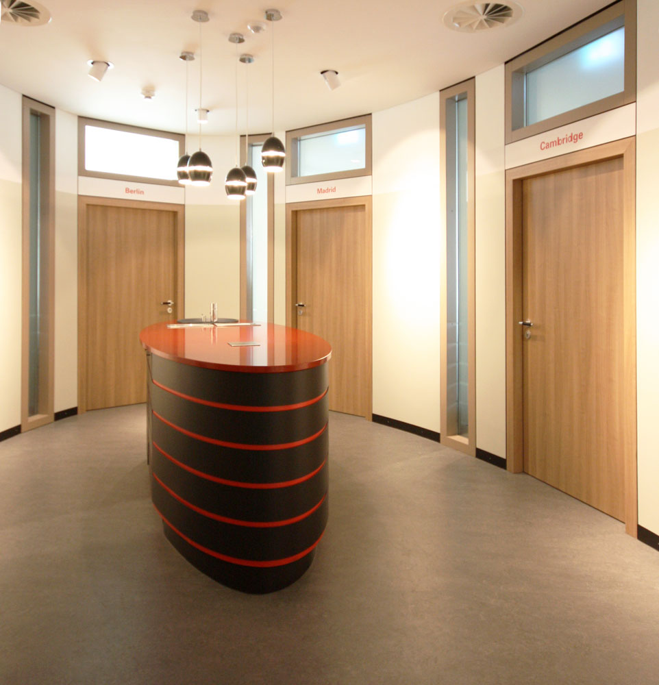 Für dieses Schulungszentrum wurden etwa 500 m² Büro- und Laboretage entkernt und neu ausgebaut. Es entstanden mehrere, teils flexibel zusammenschaltbare Seminar- und Vortragsräume sowie einladende Pausenbereiche. Interaktive Whiteboards und Computerterminals im Foyer stehen als zeitgemäße Medientechnik zur Verfügung. Die Beleuchtung ist per Touchpad steuerbar. Bei optimaler Funktionalität bieten die Räume eine warme Atmosphäre durch Holzdekor und Beigetöne. Das Tageslicht wird durch Schiebevorhänge gefiltert. Rote und schwarze Akzente verweisen auf das Corporate Design des Gastgebers.