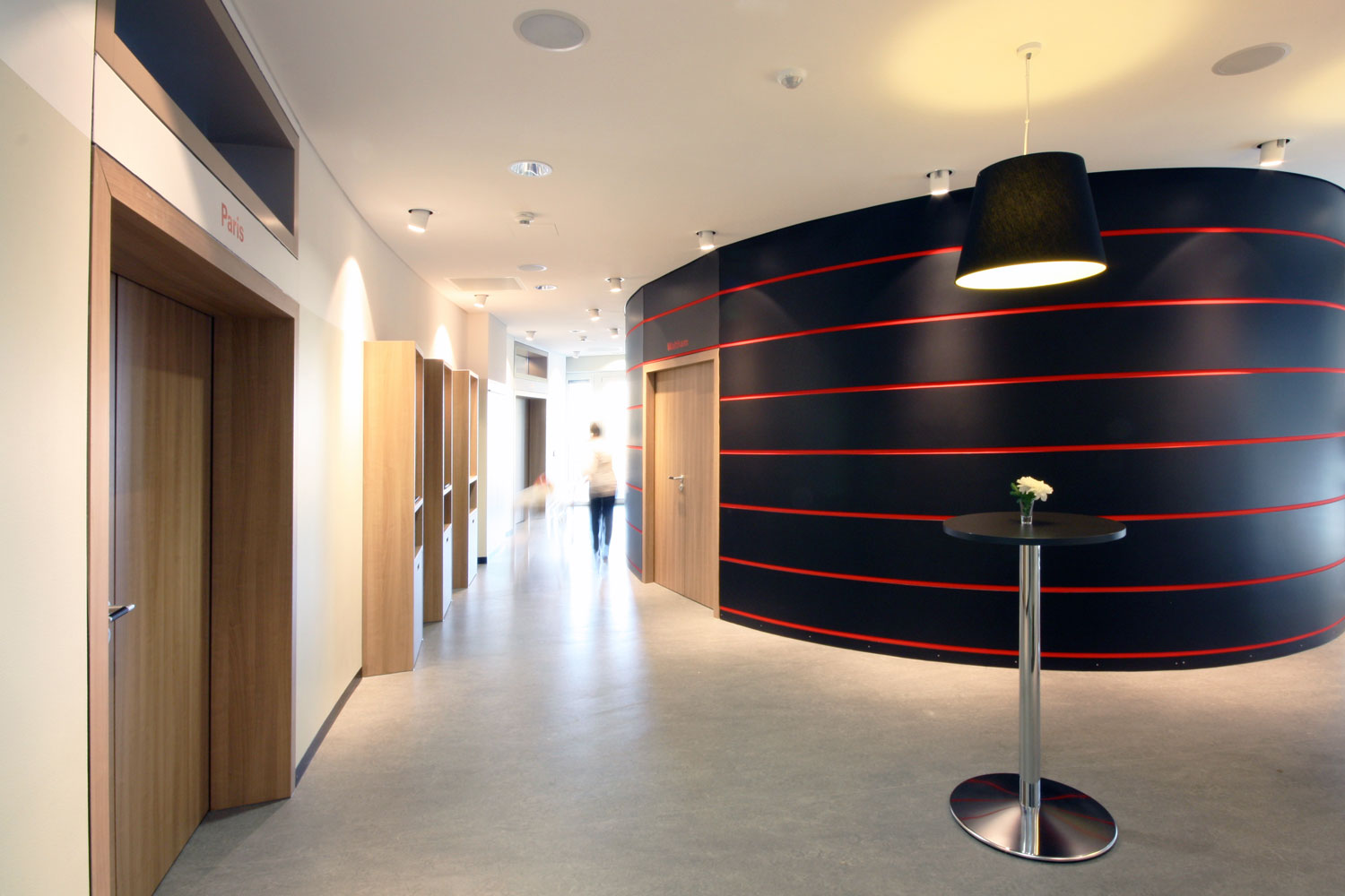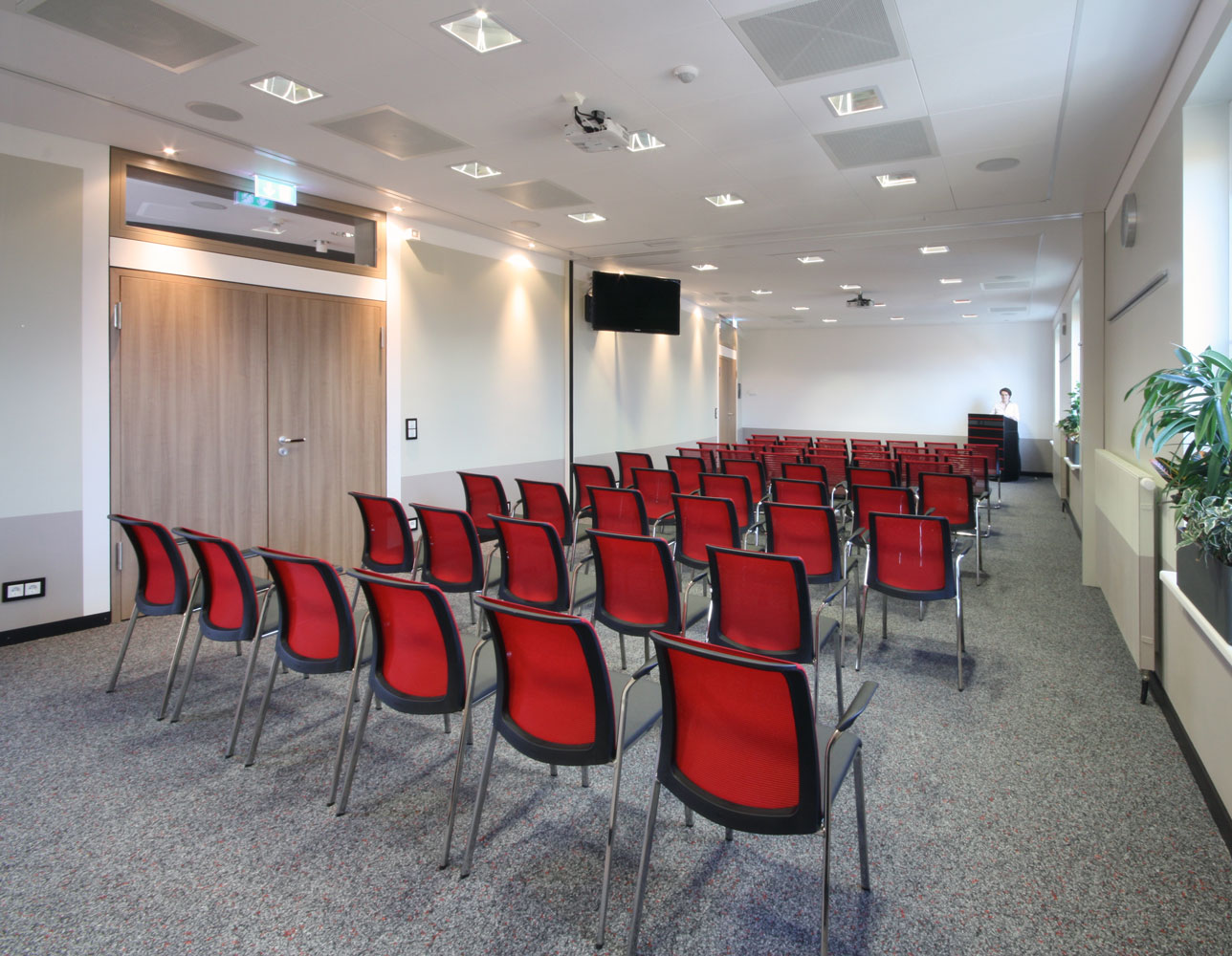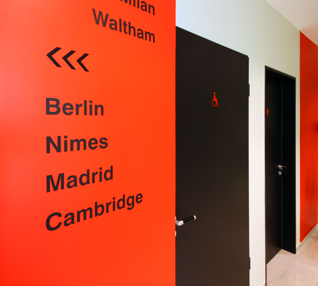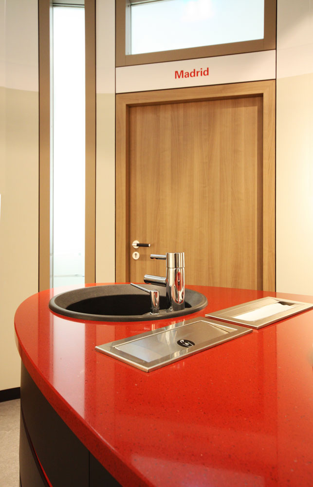 Für dieses Schulungszentrum wurden etwa 500 m² Büro- und Laboretage entkernt und neu ausgebaut. Es entstanden mehrere, teils flexibel zusammenschaltbare Seminar- und Vortragsräume sowie einladende Pausenbereiche. Interaktive Whiteboards und Computerterminals im Foyer stehen als zeitgemäße Medientechnik zur Verfügung. Die Beleuchtung ist per Touchpad steuerbar. Bei optimaler Funktionalität bieten die Räume eine warme Atmosphäre durch Holzdekor und Beigetöne. Das Tageslicht wird durch Schiebevorhänge gefiltert. Rote und schwarze Akzente verweisen auf das Corporate Design des Gastgebers.