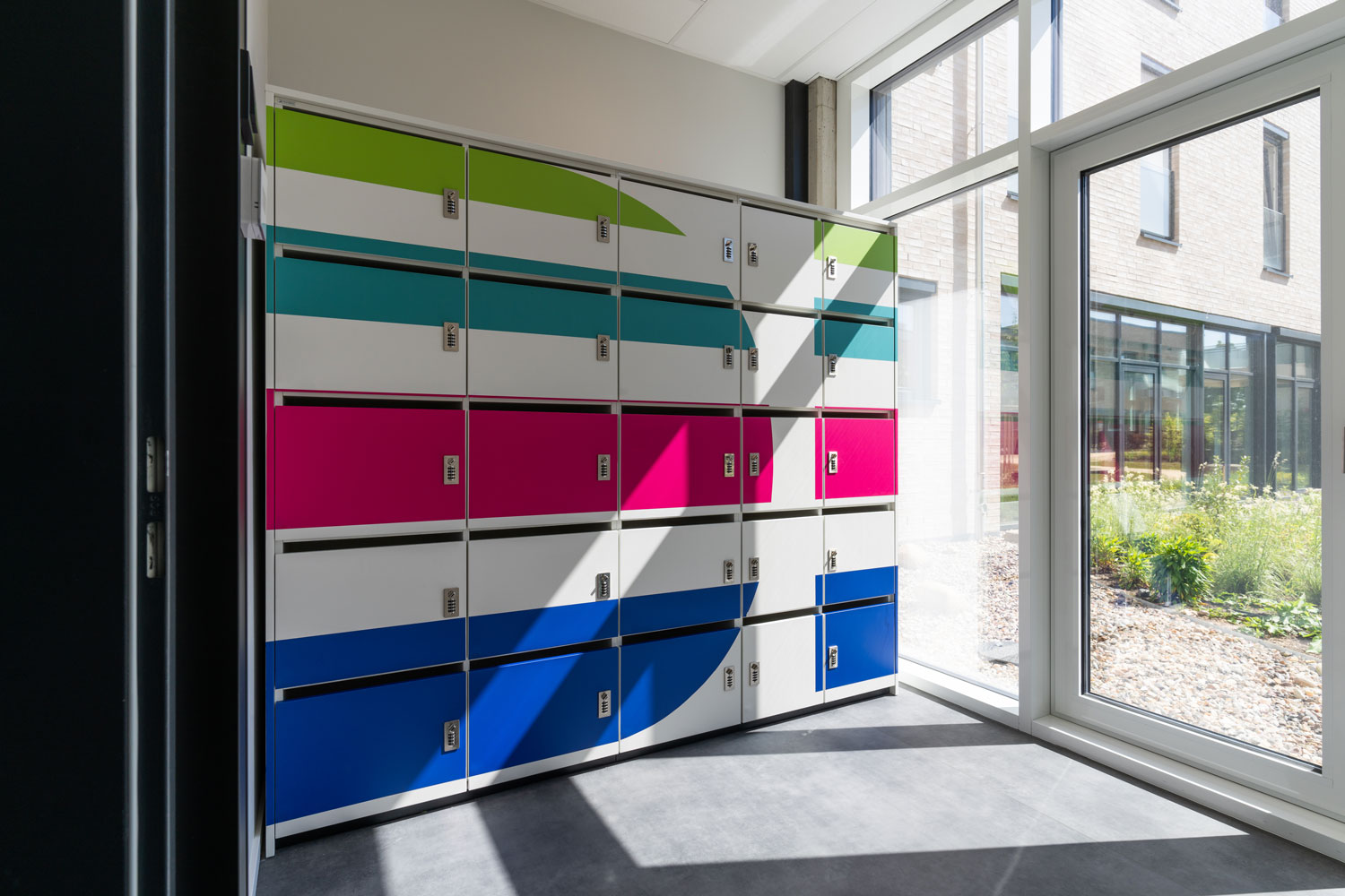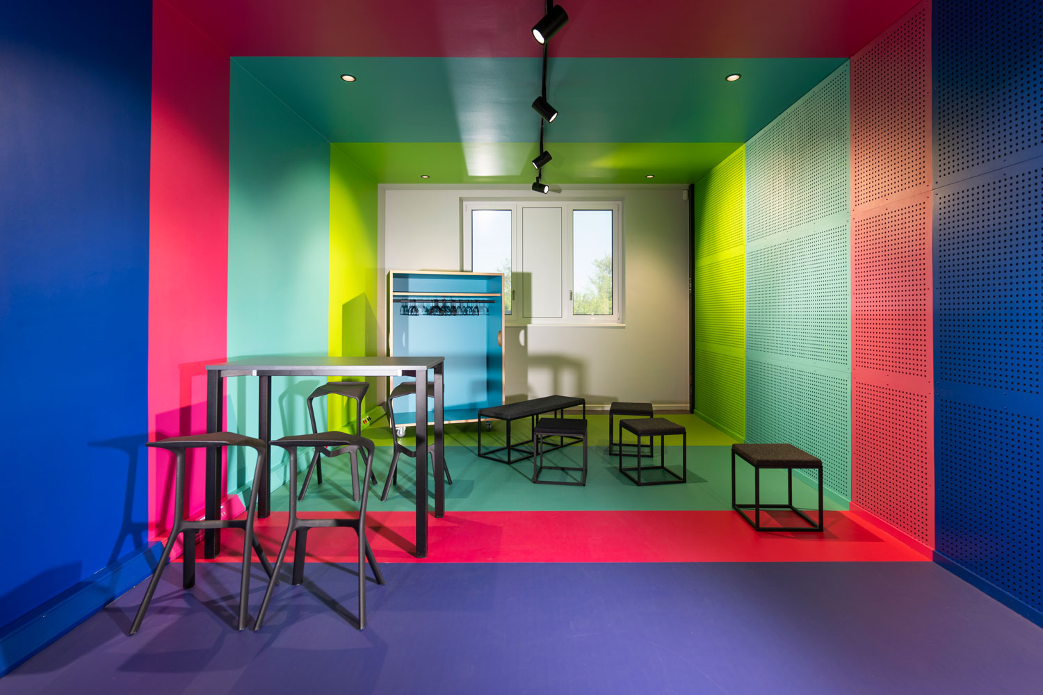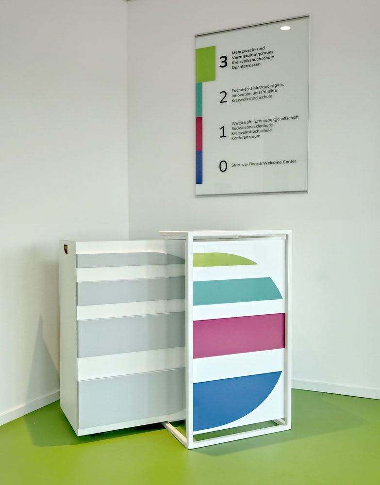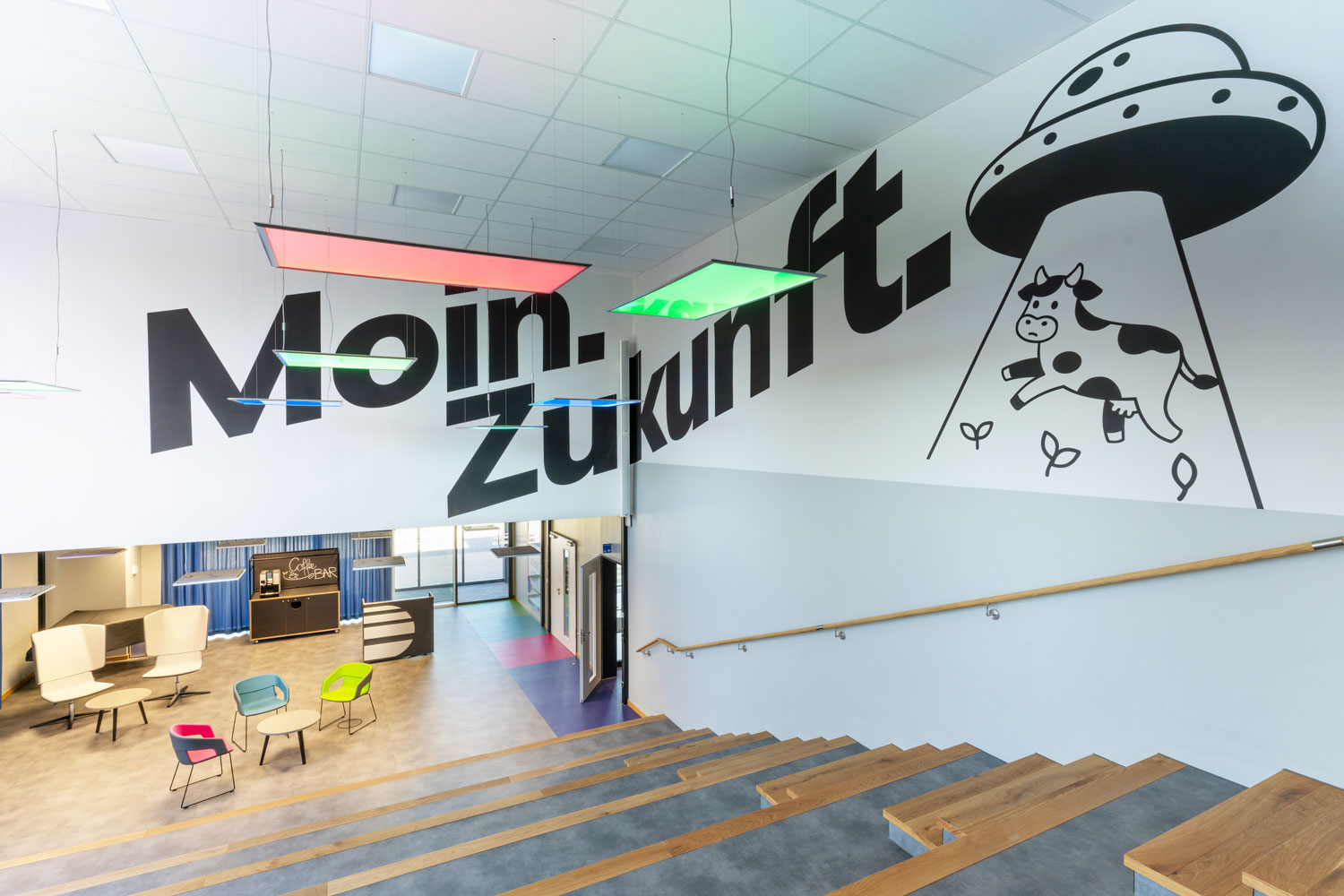 Die vorgegebenen charakterstarken CI-Farben wurden von uns im Mobiliar und im Wegeleitsystem einbezogen und an ausgewählten Punkten markant inszeniert. Bodenbereiche am Eingang und in den Etagen greifen das Hellgrün, Magenta, Cyan und Ultramarin auf. Im Atrium können die transparenten LED-Paneele in verschiedenen Farbszenarien erstrahlen!