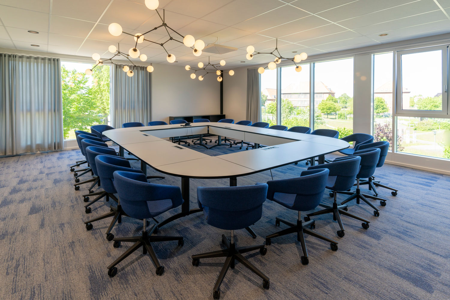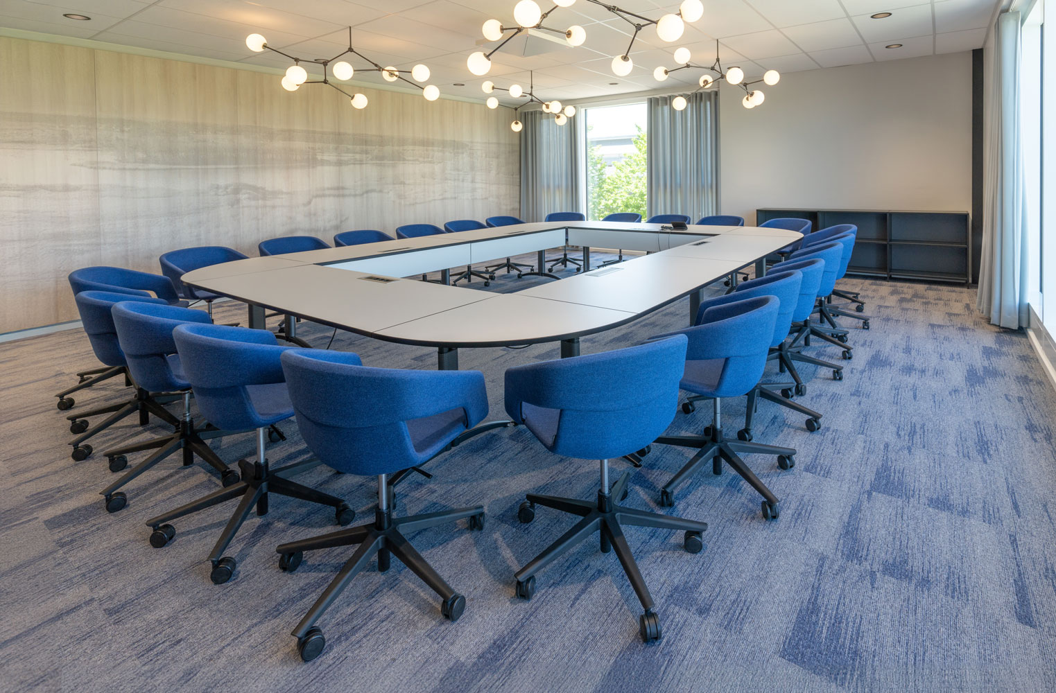 Der attraktive Besprechungsraum im Obergeschoss bietet einen fantastischen Ausblick. An einer Wand ist ein Landschaftsbild der Liegnitz als gelochte Akustikwand aus Holzwerkstoff umgesetzt worden. Die besonderen Deckenleuchten erzeugen in der Dämmerung – wie die Beleuchtung im Atrium – eine besondere Außenwirkung.