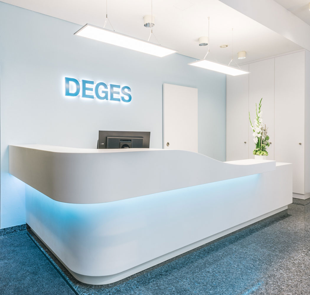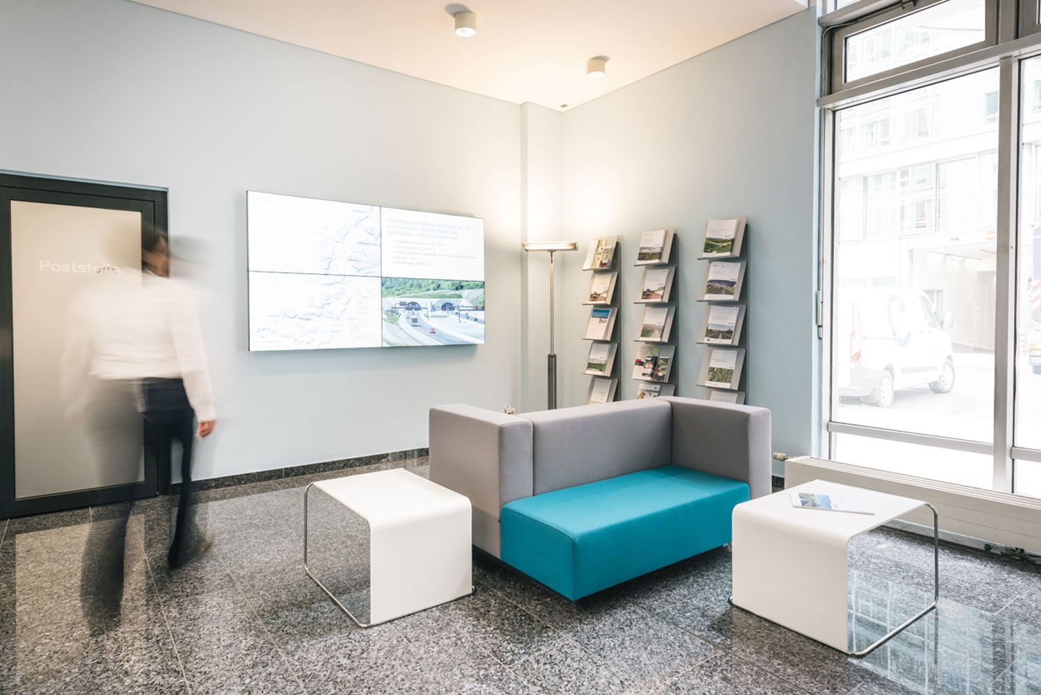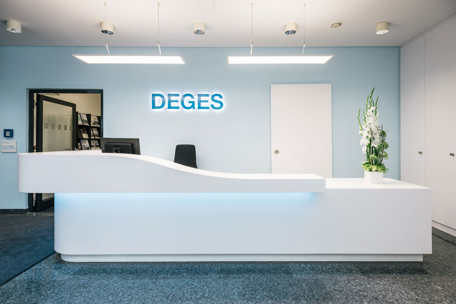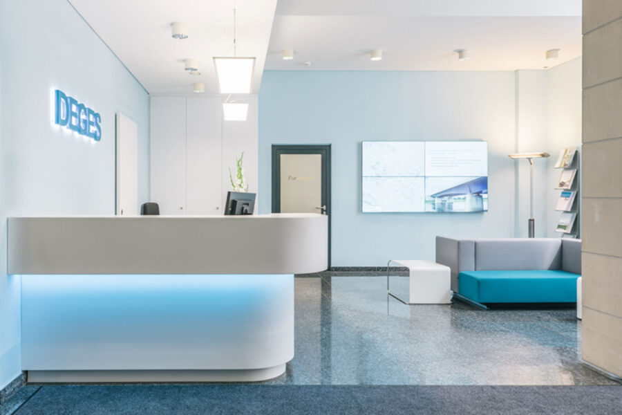 Der in die Jahre gekommene und etwas düster wirkende Empfang der Planungsgesellschaft für Fernstraßen sollte ein neues Erscheinungsbild erhalten. Dem Geschäftsfeld und der sich verjüngenden Personalstruktur wurde im Konzept besondere Aufmerksamkeit zuteil. Ein zeitgemäßer, schnittig geformter Tresen aus Mineralwerkstoff, ein verbessertes Lichtkonzept und leichter wirkende Sitzmöbel transportieren nun die Idee der Dynamik, Weite und Geschwindigkeit. Eine Videowand übernahm die Aufgabe einer museumsreifen Diodenlandkarte, die laufenden und realisierten Projekte zu vermitteln. Die neue Anordnung ermöglicht eine bessere Übersicht für das Empfangspersonal und eine angenehmere Warteposition. Die Umorganisation des Eingangsbereiches erforderte auch die Verlegung einer Brandschutztür und den Abriss eines Podestes. Dezent wurde eine Nebentür durch ein weißes Schiebepaneel mit verdeckten Beschlägen versteckt; der neue Stauraum im Einbauschrank fügt sich architektonisch in die Struktur der Empore ein.
