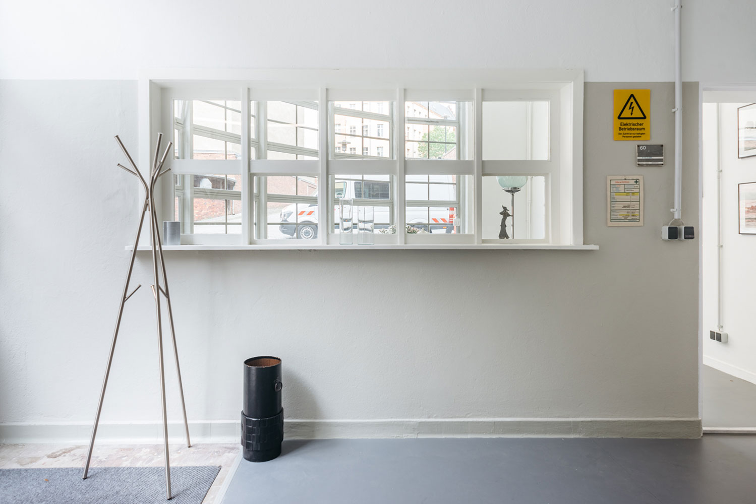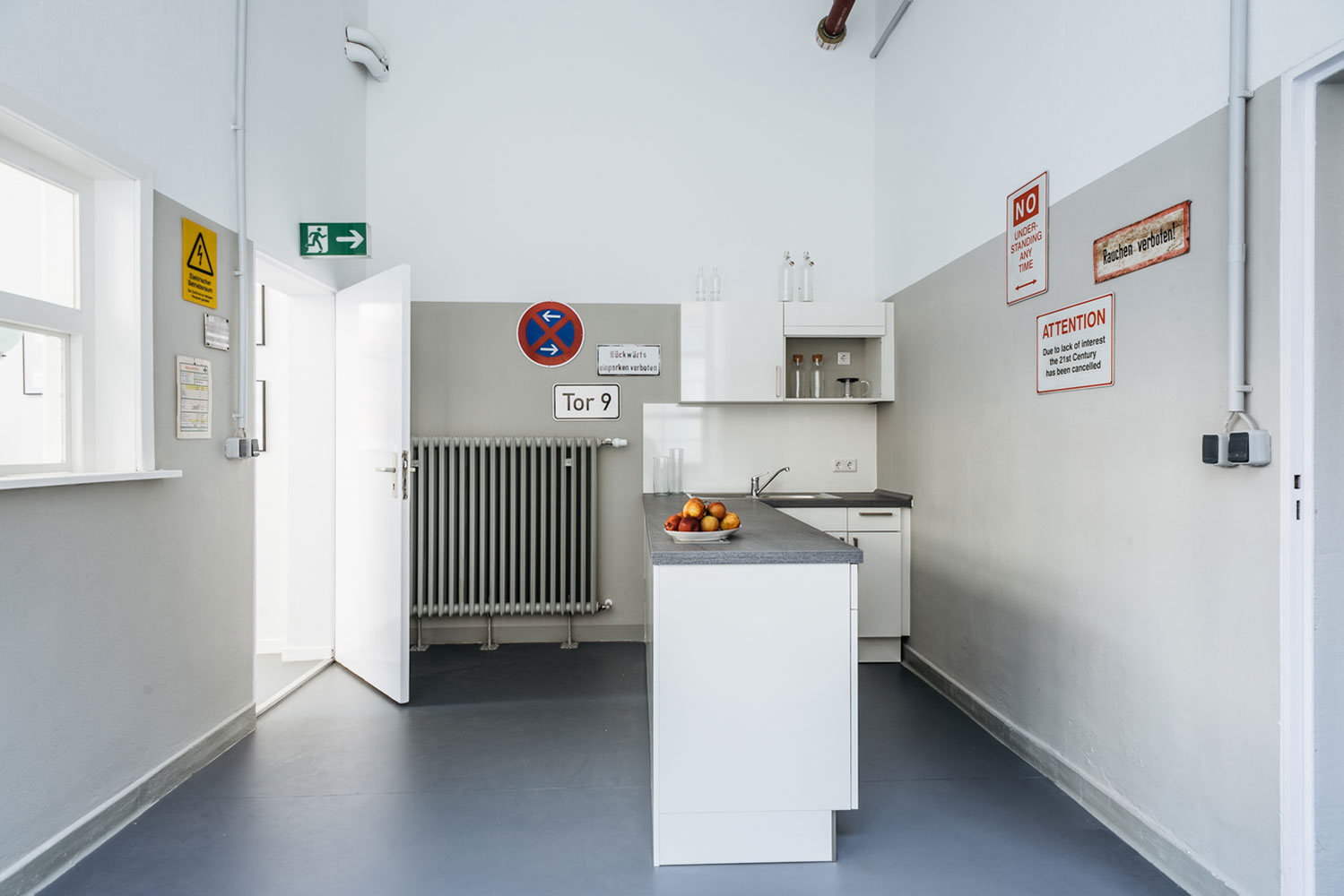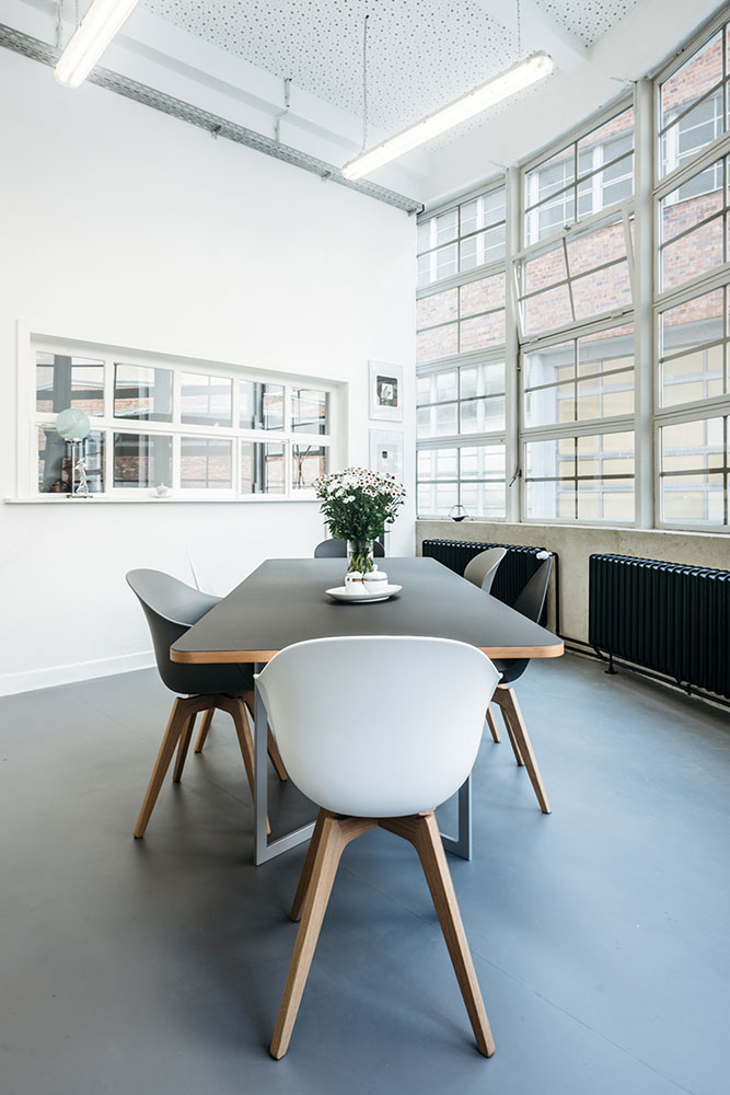 Der Umzug des Unternehmens in ein denkmalgeschütztes Gebäude stellte einige Herausforderungen. Durch den Einbau eines Podestes, Beratung bei der Grundrissaufteilung und Raumschalloptimierung sowie eine zurückhaltende Farbgebung kommt das historische Umfeld gut zur Geltung, und gleichzeitig wird konzentriertes Arbeiten ermöglicht. Die Gestaltung der Toilettenräume bot die Möglichkeit einer ebenfalls historisierenden Anmutung passend zum Industrie-Ambiente. Die Teeküche ist Zwischen- und Kommunikationszone mit Witz – hier verweisen Schilder auf die frühere Nutzung.