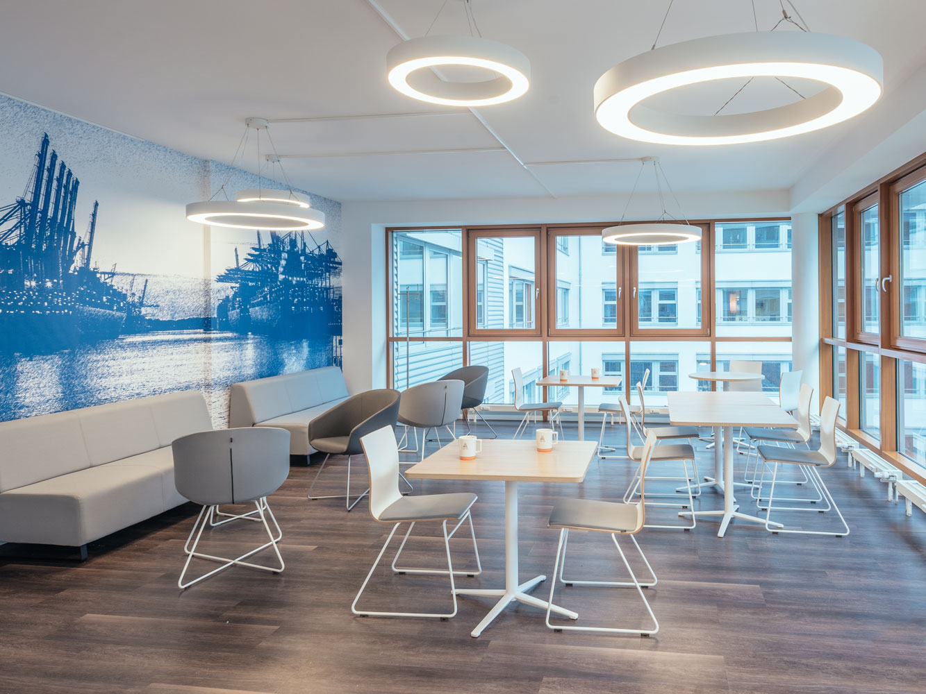Vorgaben zur Beleuchtung und den Leuchten wurden sind ebenfalls im Gestaltungshandbuch beschrieben. So werden die Gemeinschaftsräume wie Empfangsbereiche, Teeküchen oder Besprechungsräume mit verschieden großen weißen Ringleuchten erhellt. In den Fluren hingegen greifen rechteckige Langleuchten die Idee von Fahrbahnmarkierungen auf. Orange Stehleuchten betonen gemütliche Loungebreiche.Fotos: Emmanuel Decouard / raumdeuter