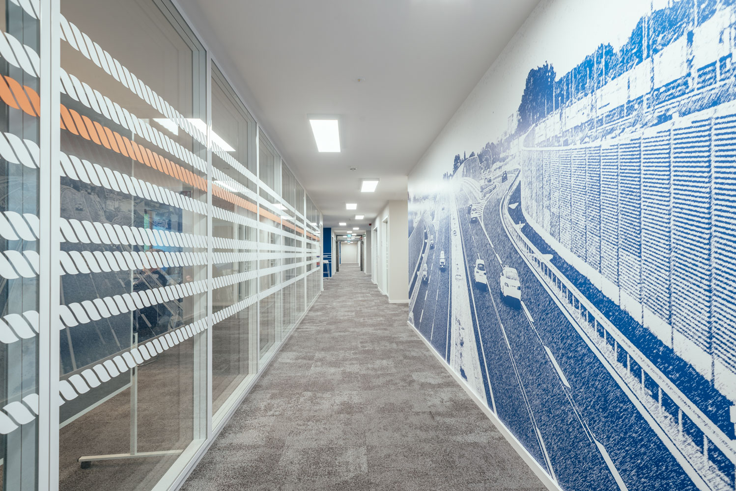 Ziel der Gestaltung war eine hohe Widererkennbarkeit der Büro-Flächen, egal ob es sich um Alt- oder Neubauten handelte. Unser Leitgedanke war dabei die Kombination des neuen Autobahn-CI mit festgelegtem Blau- & und Orange-Ton sowie der Hausschrift und zugleich autobahntypischer Merkmale wie Asphalt, Leitplanken und der bekannten Verkehrs- oder Infoschilder.Farb- und Materialkonzept