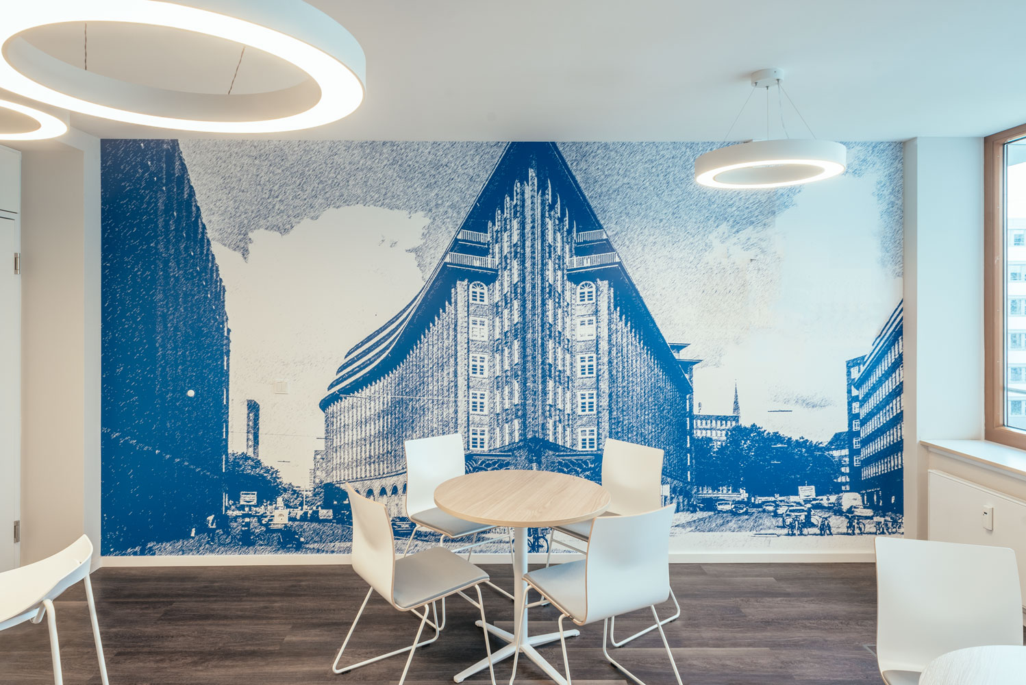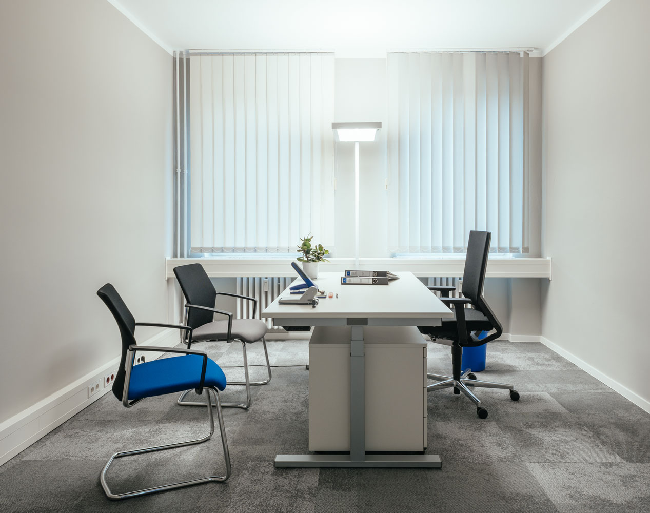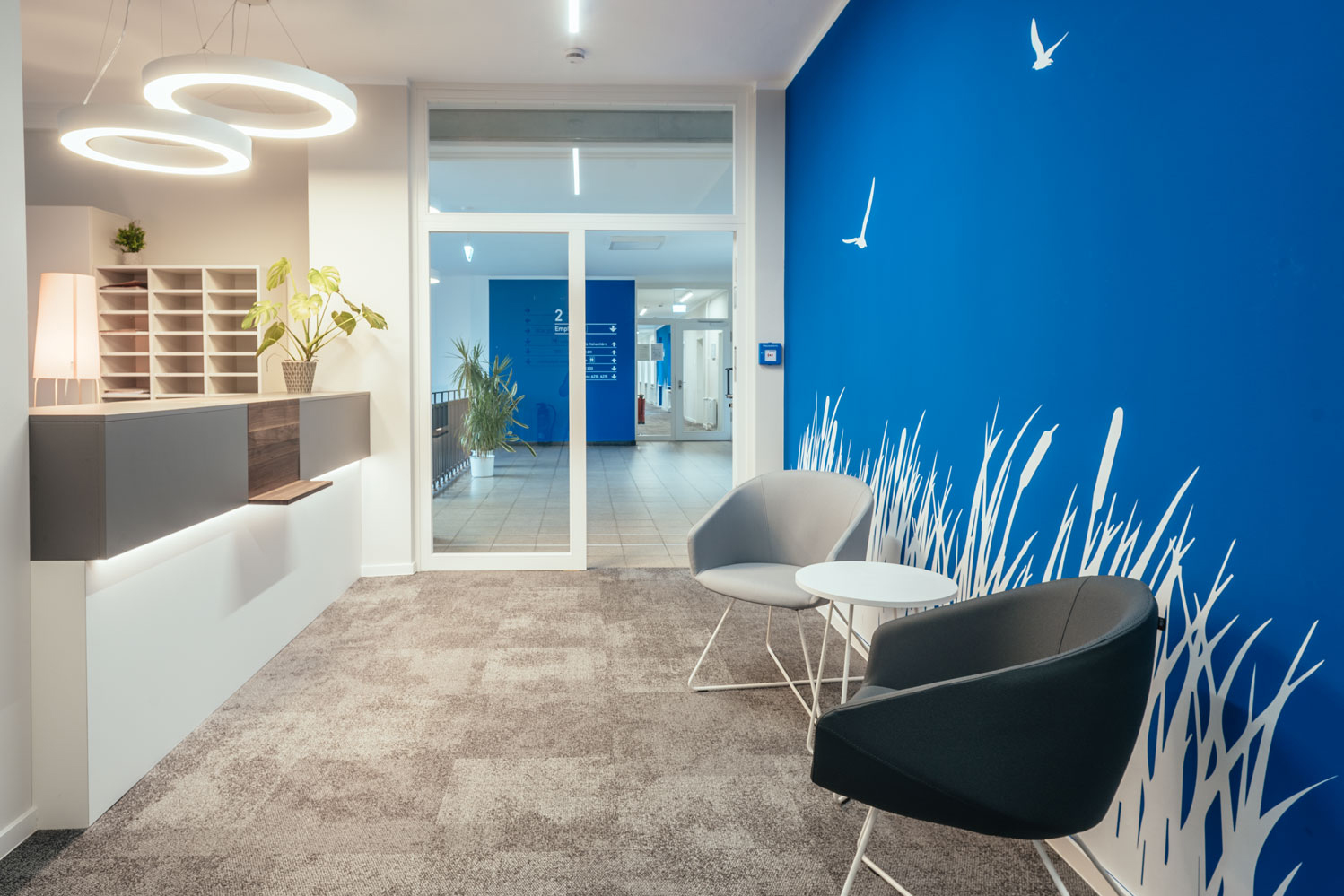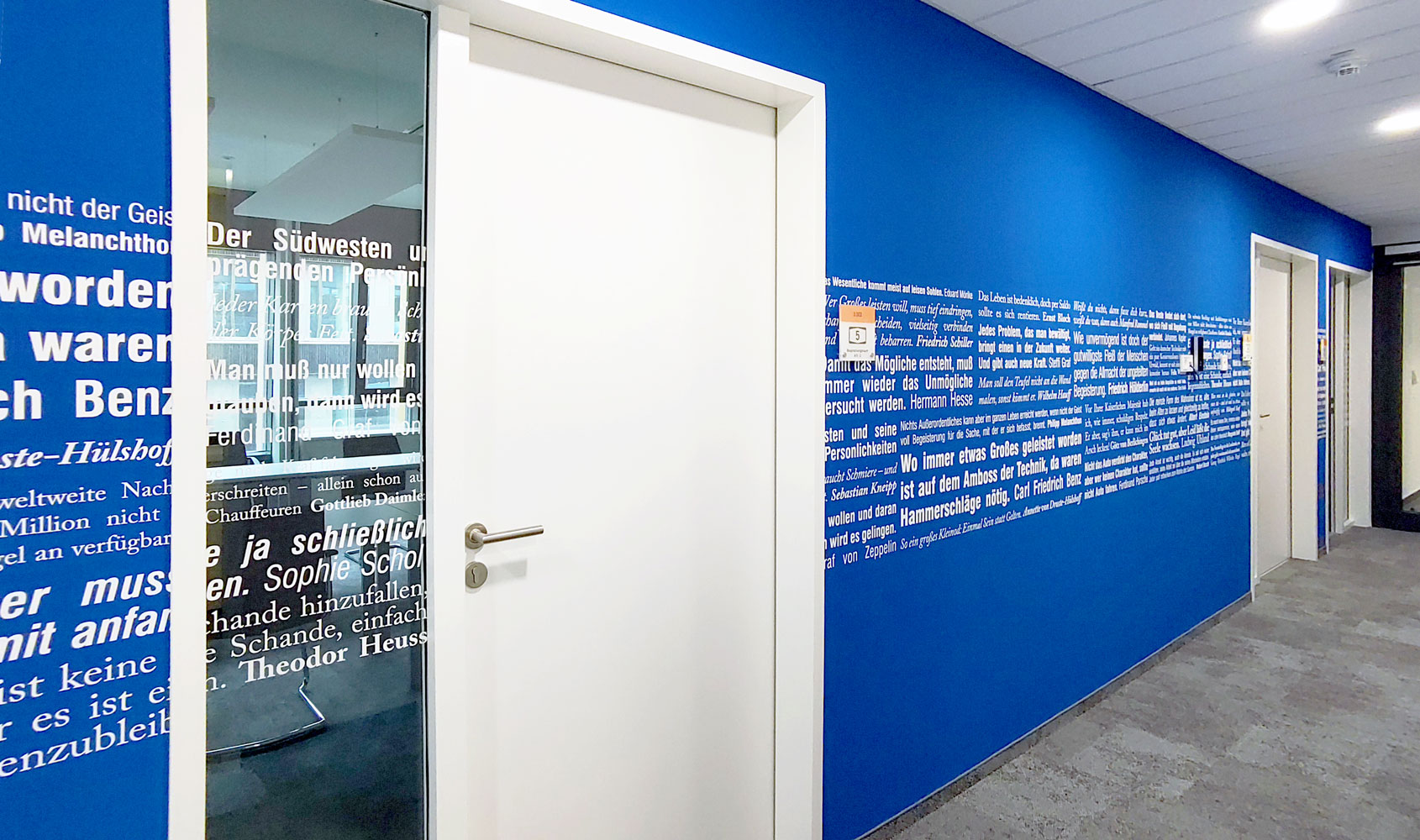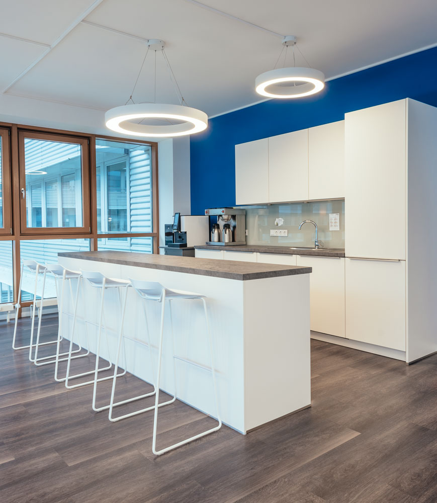 Die Basis bildet ein neutrales Farb- und Materialkonzept aus Beige- und Grautönen. Durch zwei verschiedene Nuancen bei den Teppichfliesen können Büro- und Erschließungsflächen unterschieden werden. Aufenthaltsräume wie Teeküchen oder Besprechungsräume erhalten holzfarbene Vinylplanken mit ähnlicher Tönung. Blickfang sind jeweils Flächen im CI-Farbton Blau als Wandfarbe oder Motivtapete und einige Akzente in Signal-Orange. Dies setzt sich auch bei der Möblierung fort. Möbel in Weißtönen dominieren und heben sich somit von der Wandfarbe ab. Ergänzend dazu gibt es Polstermöbel in Grautönen und einige wenige Möbel in Akzentfarbe. Alle Material- und Farbangaben sowie weitere Ausstattung sind im Gestaltungshandbuch genau dokumentiert.Regionalität