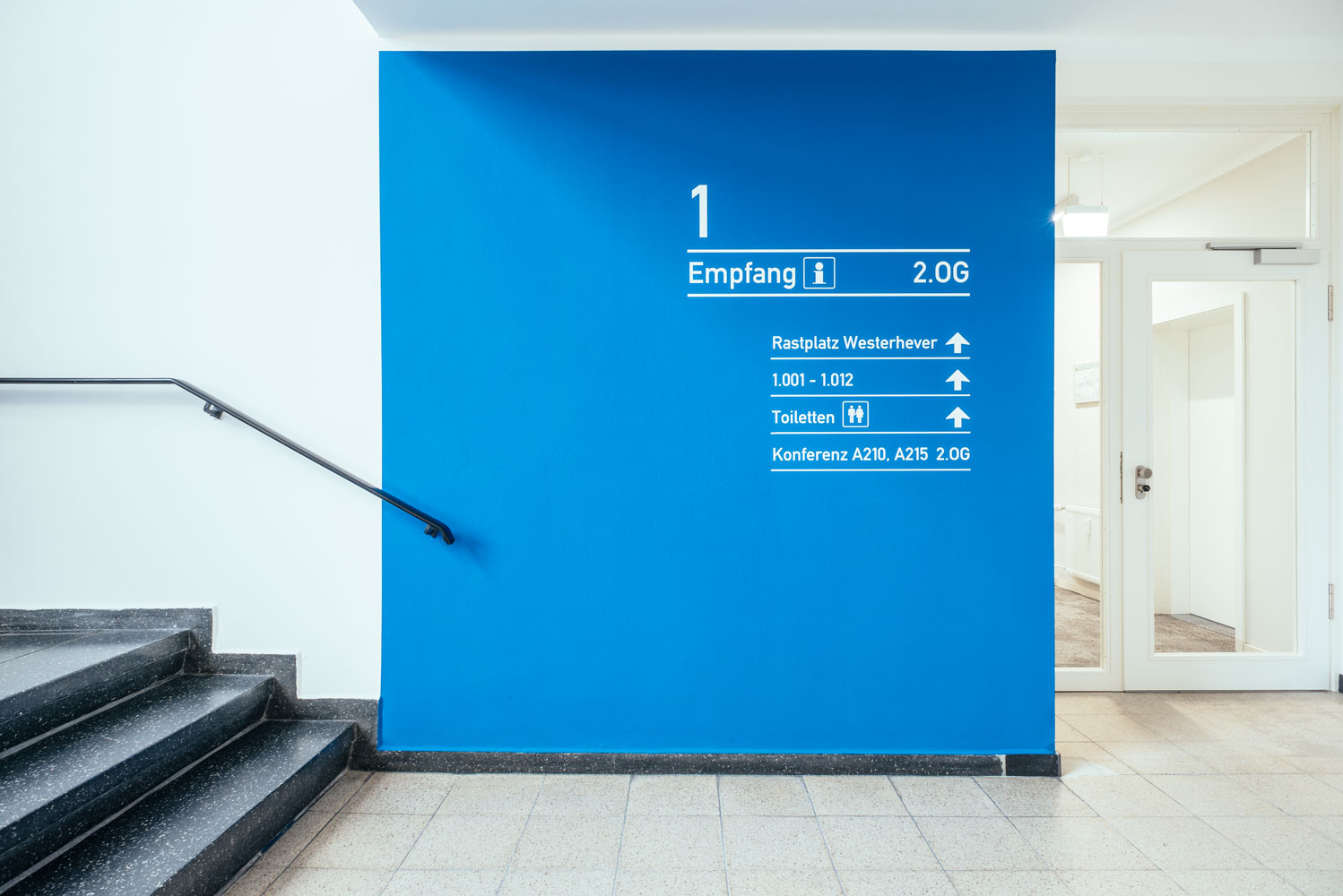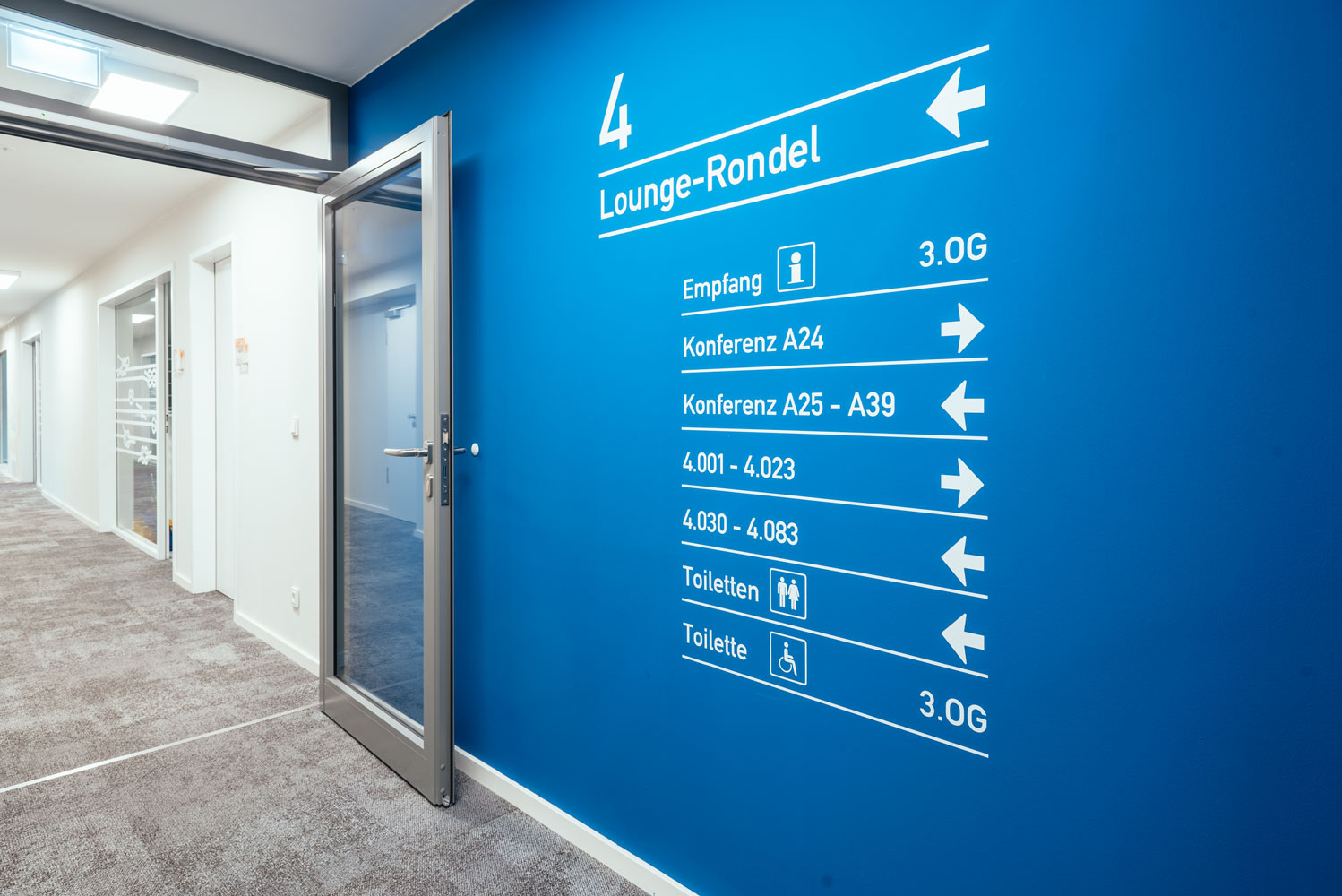 Vor allem die Signaletik sollte an allen Standorten einheitlich sein und besteht aus verschiedenen Elementen. So gibt es im Eingangsbereich eines jeden Standortes eine Autobahnnetzkarte mit allen Autobahnen und dem markierten Standort aber auch eine Regionalkarte mit dem vor Ort zu betreuenden Gebiet. Darüber hinaus gibt es ein einheitlich festgelegtes Erscheinungsbild des Wegeleitsystems. Dazu gehört eine definierte Gliederung aber auch eine verbindliche Vorgabe für Icons mit Bezug zu den Grafiken von der Autobahn. Auch die Beschilderung der einzelnen Räume ist einheitlich für alle Standorte geregelt.Beleuchtung