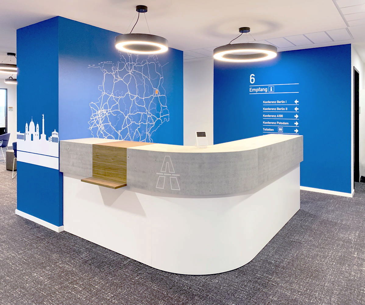 Der Empfangstresen variiert in Länge und Form je nach Bedarf und Platzangebot am Standort. Einheitlich ist jedoch das Aussehen, das modular angelegt wurde: Auf einem weißen Korpus sitzt ein hinterleuchteter streifenförmiger Block in Betonoptik und dem geprägtem Autobahn-Logo. Eckmodule sind immer gerundet. Eine Holz-Ablage markiert den Anlaufpunkt für Gäste und Besucher.Infografiken und Wegeleitsystem