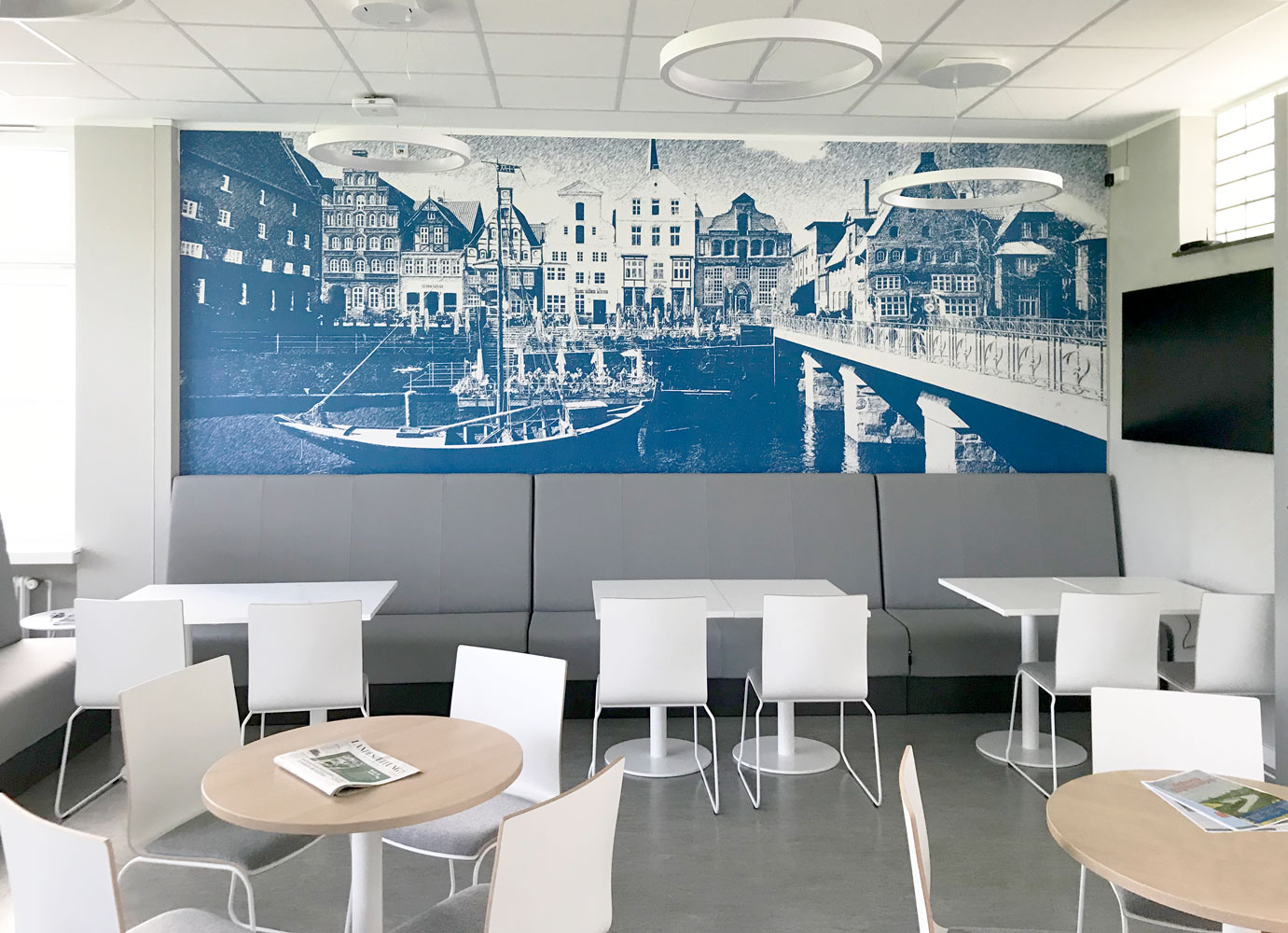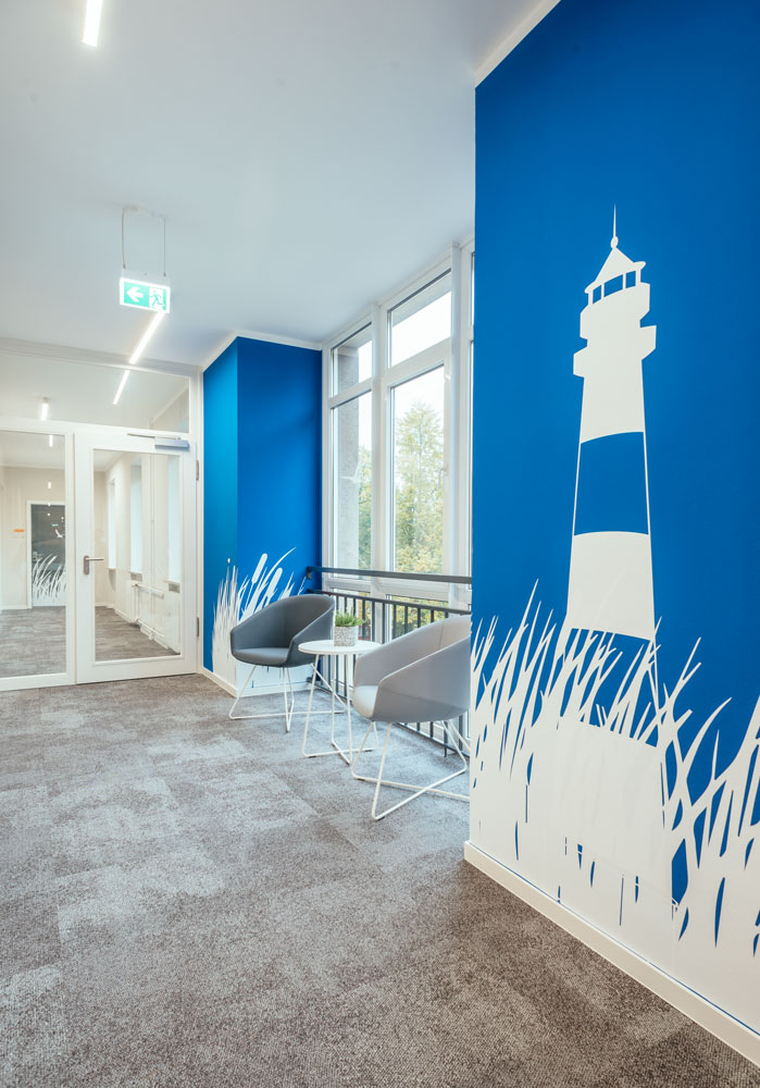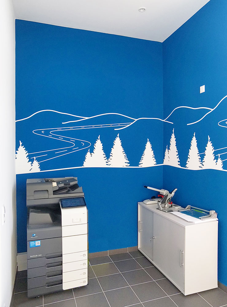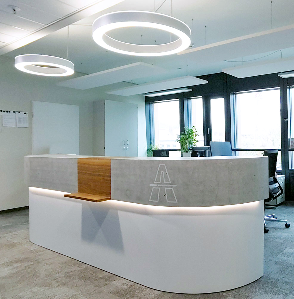 Die Motive der Fototapeten und Flurgrafiken wurden mit Standortbezug ausgewählt und dienen so der Identifikation mit dem Arbeitsort und der Region. Für Pausenräume und Teeküchen sollten Sehenswürdigkeiten der Umgebung, für Besprechungsräume hingegen Verkehrsbauwerke gezeigt werden. Dabei durften die Mitarbeitenden vor Ort Vorschläge und Wünsche einbringen. So blieb es auch den einzelnen Standorten überlassen, ob bei der Flurgrafik ganz allgemein regionale Themen aufgegriffen wurden (z.B. Möwen an der Küste oder Kühe und Schafe in Niedersachsen) oder konkrete Bauwerke des jeweiligen Standorts abgebildet wurden. Darüber hinaus gab es jeweils gesonderte Budgets für Sondermöblierungen der Aufenthaltsbereiche, so z.B. Strandkörbe für die Küste oder Kuckucksuhren für den Schwarzwald.Empfangstresen