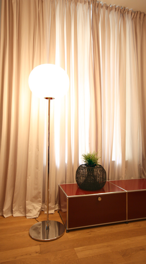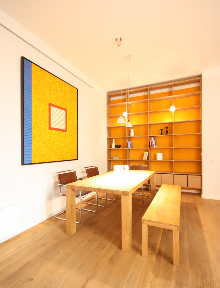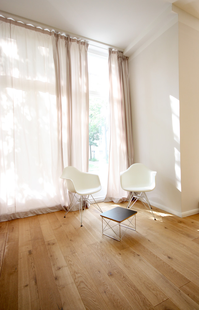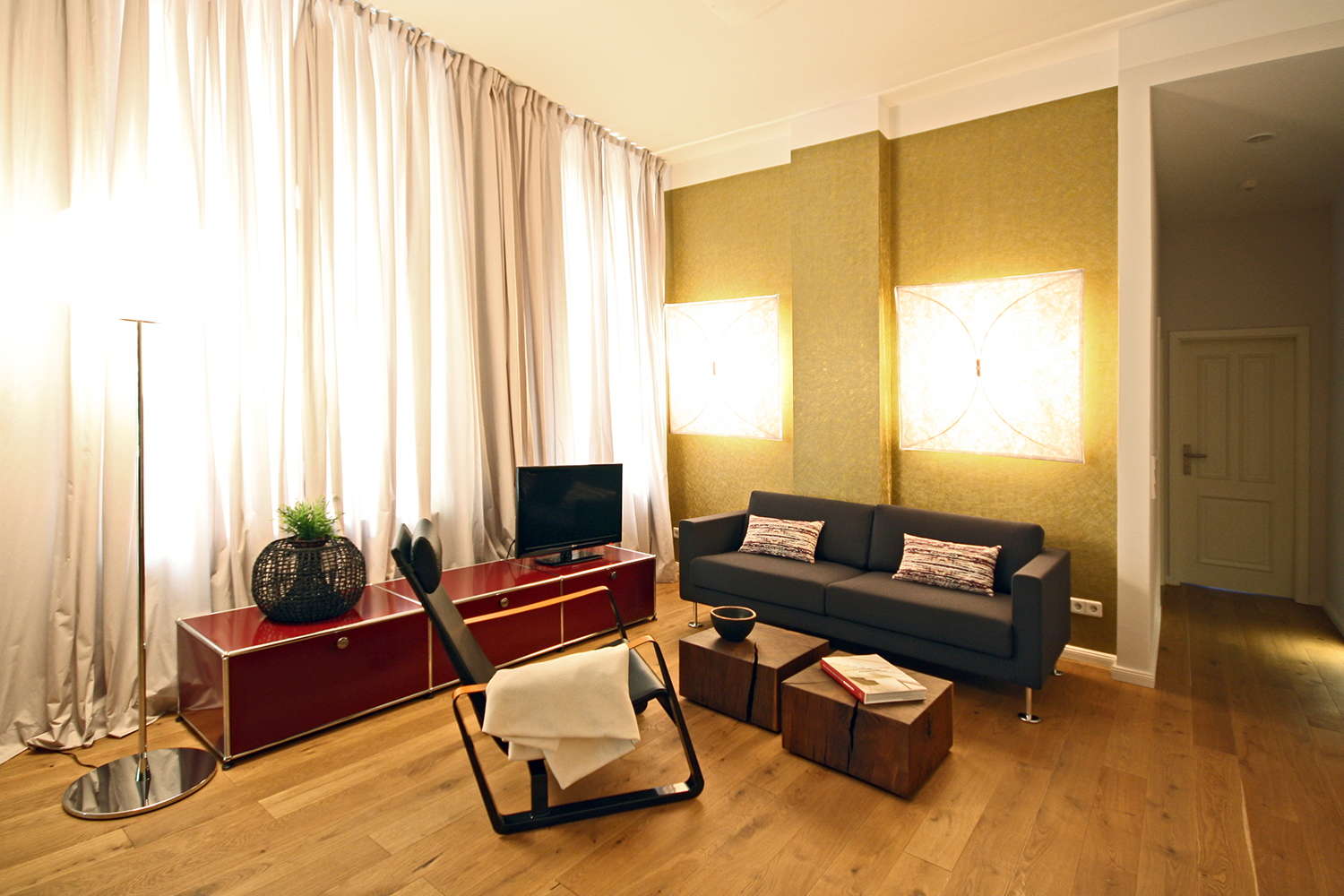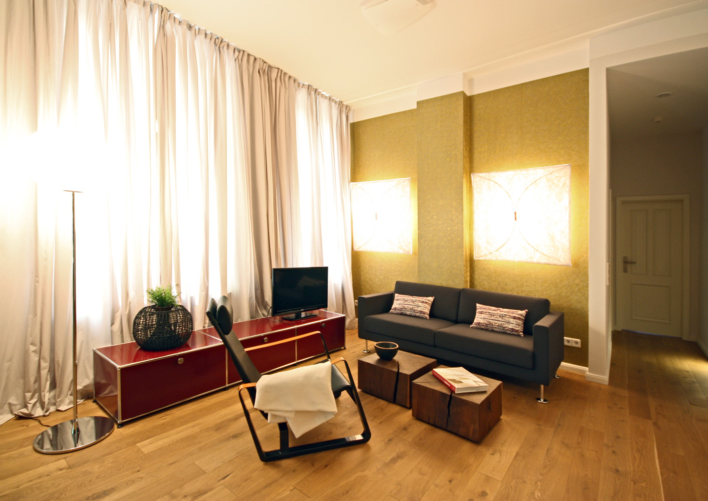 Die Farben sind mit einem hellen Fries klar von der Decke abgesetzt. Leicht getönte, durchscheinende Vorhänge und hochwertige Möbel sowie eigens konzipierte Sondereinbauten geben den Räumen trotz verspieltem Farbkonzept eine mondäne Eleganz.