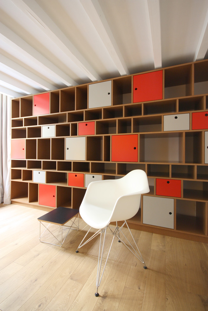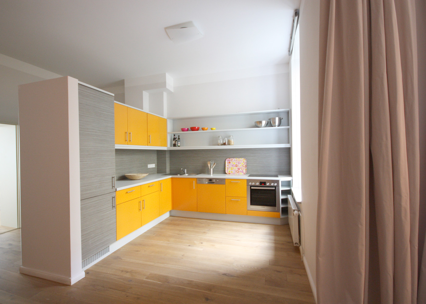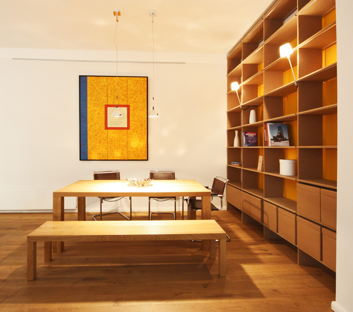 Kleine Wohnung flexibel und multifunktional: Es galt in einem traditionellen Berliner Ladengeschäft mit angrenzender Erdgeschosswohnung mehrere Ansprüche zu verbinden. Im Raum zur Straße wurde ein luftiger Raum für Beratungen und Buchungen geschaffen, im hinteren Teil der Fläche ein Rückzugsort mit Übernachtungsmöglichkeit für die Familie. Der Übergangsbereich mit Küche und Esstisch dient sowohl den Angestellten als Pausenraum als auch als Wohnbereich am Wochenende.