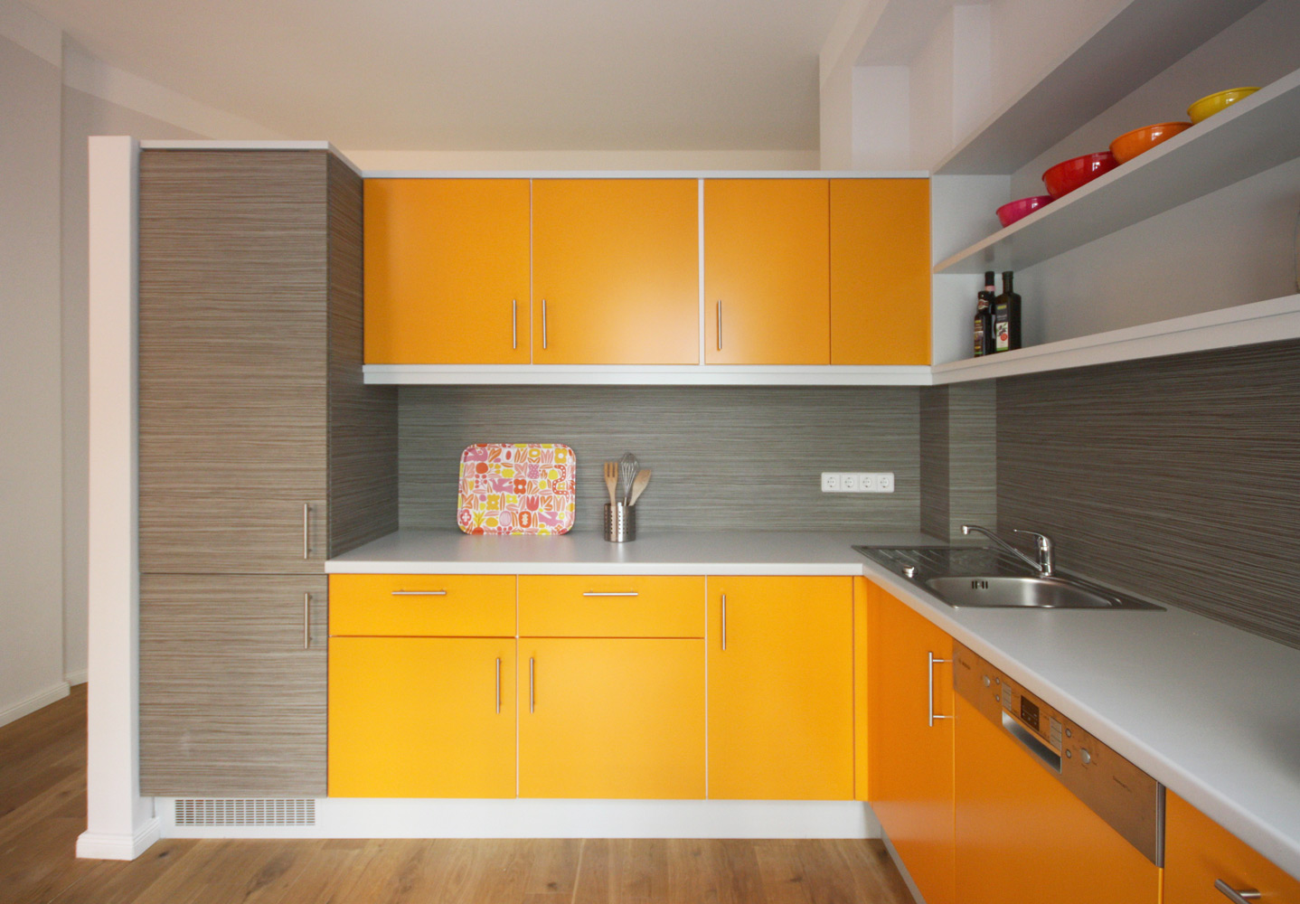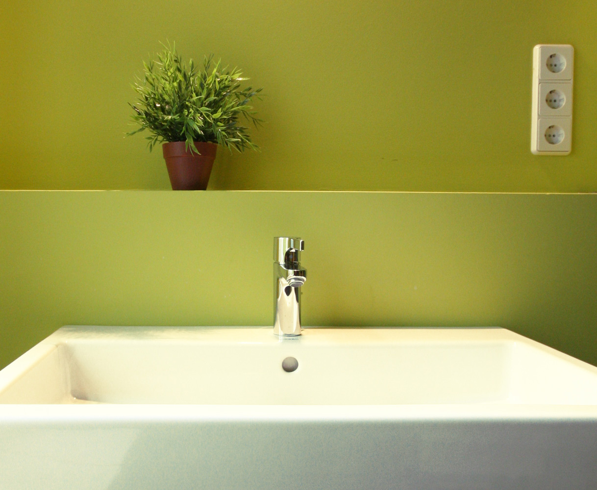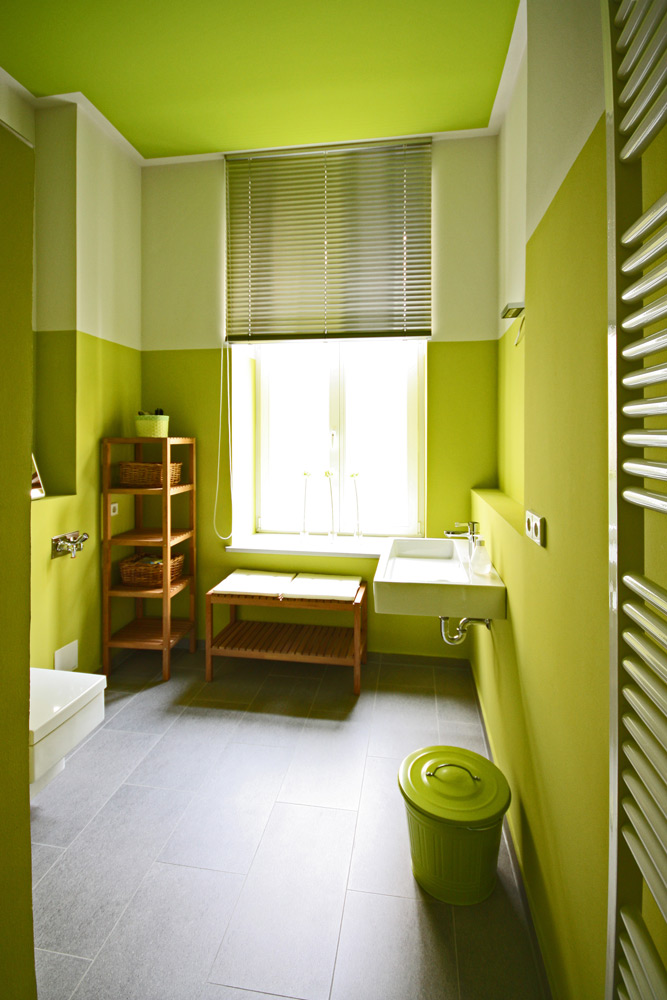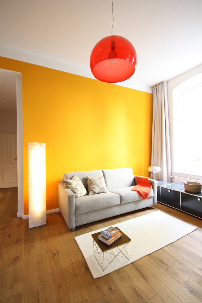 Kräftige Farben verleihen den Räumen Charakter und eine fröhliche Atmosphäre. Ein helles Grün bringt biophile Frische – im Bad sogar raumgreifend. Ein helles Gelborange assoziiert Sonnenlicht und südliche Wärme, von roten Akzenten unterstützt. Dazu schrieb Houzz in einem Artikel: „Wie ein gut gemixter Tequila Sunrise zaubert diese Wand eine ordentliche Portion Sonne in das sonst eher schlichte Wohnzimmer. Die Gelb-Orange-Töne erzeugen eine wohnlich-warme Stimmung und werden durch die ebenfalls warme Holzfarbe des Bodens noch unterstützt.“