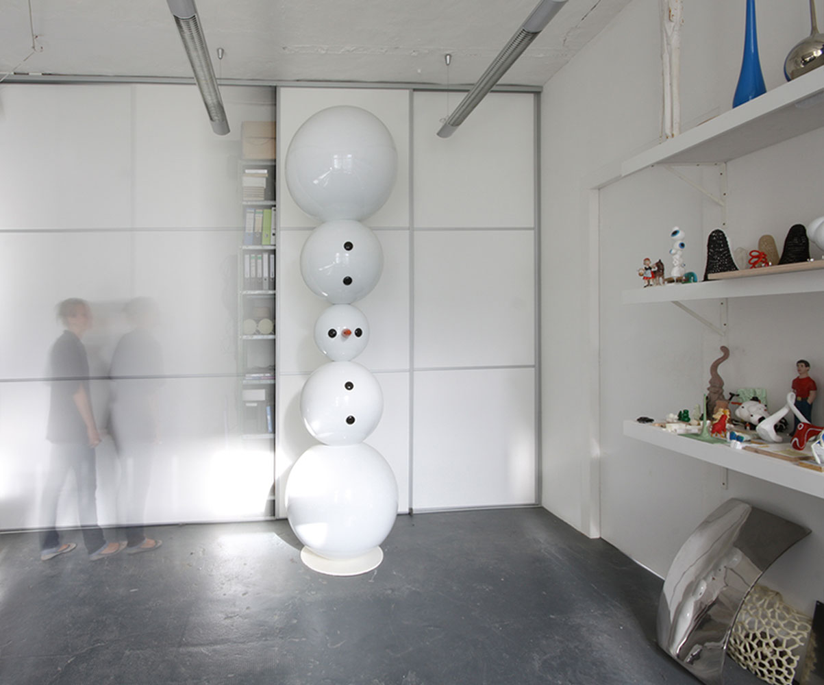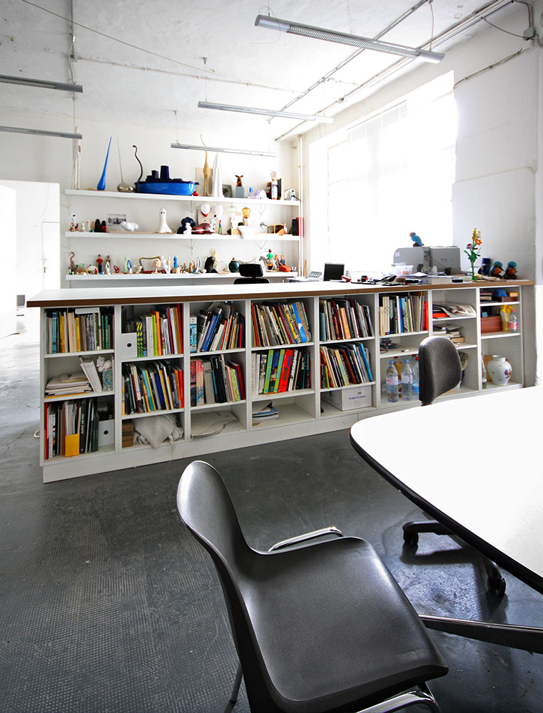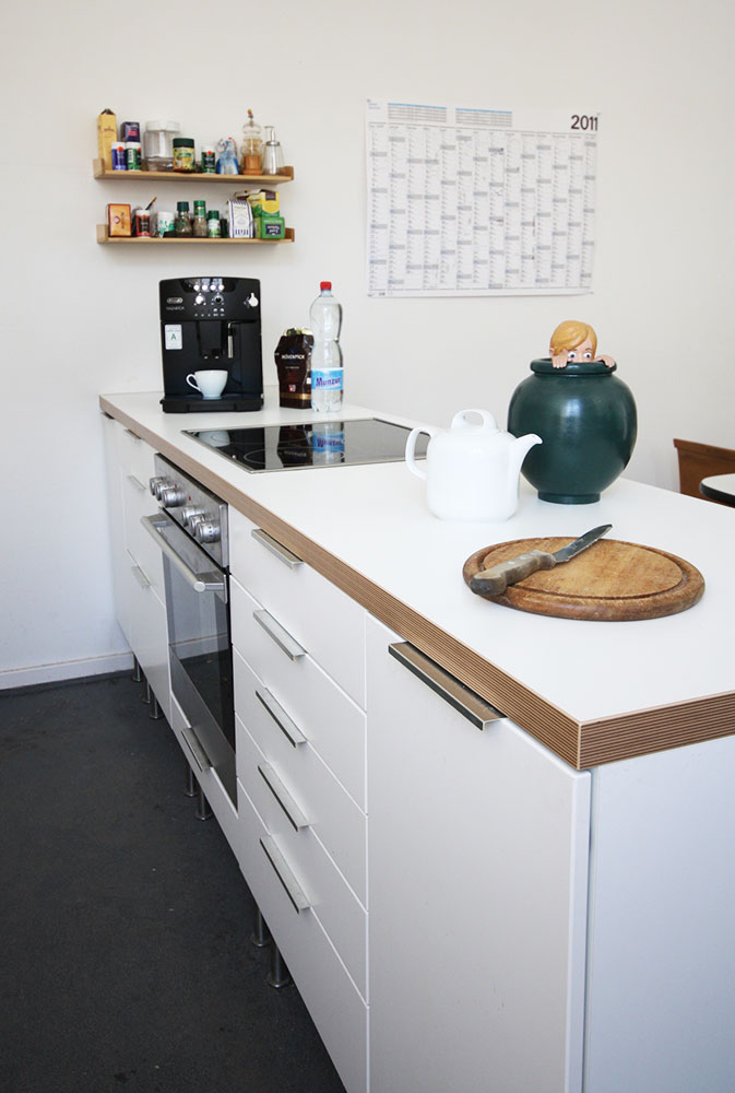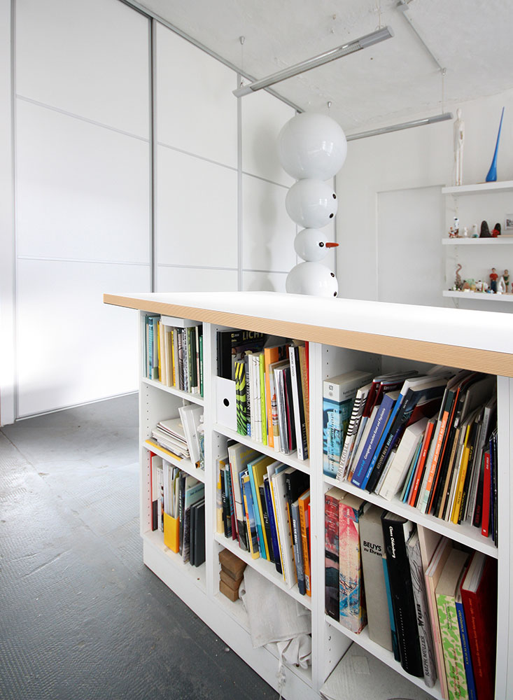 Die Berliner Künstlergruppe wünschte sich für ihr Atelier-Büro in einem Industrie-Altbau eine großzügige und offene Gestaltung. Große Arbeitsflächen in verschiedenen Höhen ermöglichen sowohl flexibles Arbeiten als auch ungezwungene Kommunikation. Neben einer neuen Beleuchtung war vor allem viel Stauraum für Modelle und Akten notwendig. Dieser wurde unter anderem hinter raumhohen Schiebetüren geschaffen. Die hellen, geradlinigen Möbeloberflächen bieten eine Bühne für die farbigen, formenreichen Skulpturentwürfe. Um Kosten zu sparen, wurden Selbstbaumöbel mit Tischlerarbeiten kombiniert.Fotos: raumdeuter