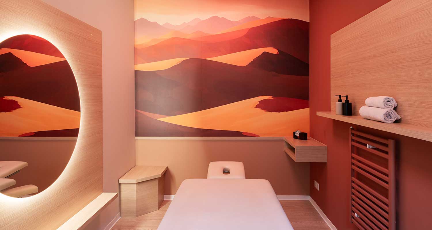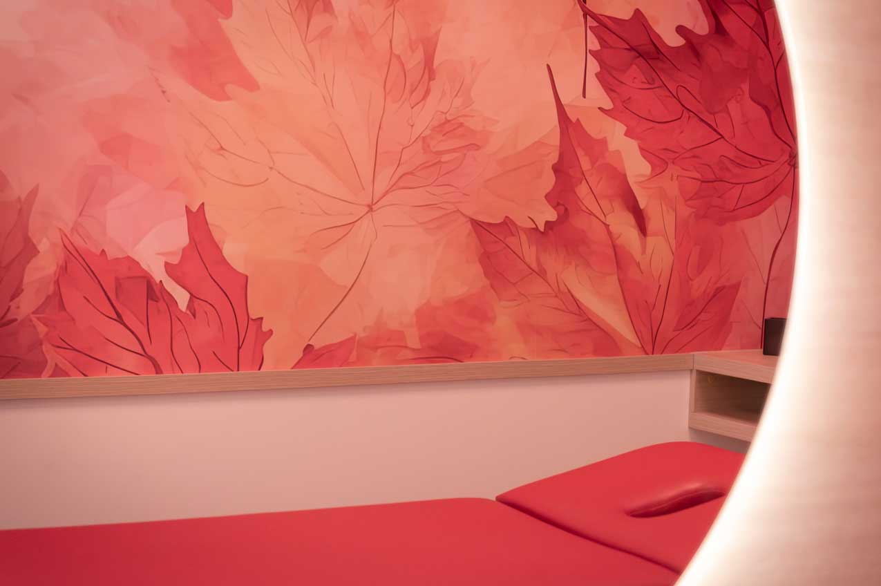 Die Räume sind thematisch gestaltet und erzeugen jeweils eine ganz eigene Atmosphäre: Herbstlaub in Rot, Gebirge in Anthrazit, Wasser in Blau, Wüste in Gelb-Orange und Wiese in Grün. Die satinierten Glastüren wurden passend zum Raumthema gestaltet. Jedes Farbkonzept wird durch helles Holz als Bodenbelag und in den Einbaumöbeln ergänzt. Die offenen Regale bieten Stauraum und Ablagefläche für Physiotherapie-Materialien. Darüber hinaus sind sie wiederkehrendes Element in allen Behandlungsräumen und greifen in ihrer Holzoptik die Gestaltung des Empfangsbereich wieder auf. Ein obligatorischer Therapiespiegel wurde mit dahinter liegendem Lichtband als stimmungsvolles Gestaltungselement in jedem Raum umgesetzt.
