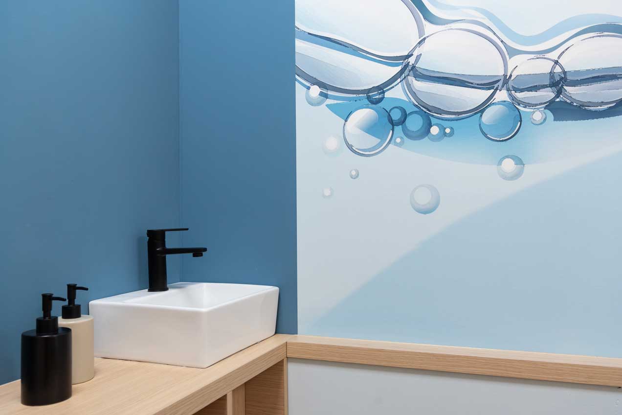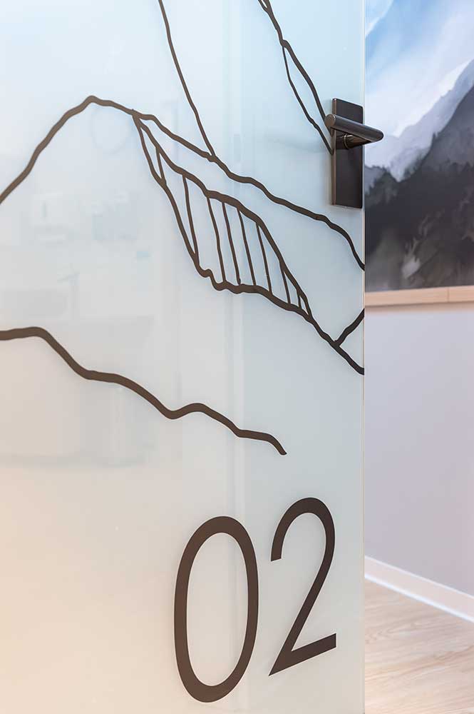 Die Türdrückergarnituren und die Türmotive wurden in elegantem Schwarz umgesetzt, um einen hohen Kontrast für eine optimierte Orientierung für Sehbeeinträchtige zu erzeugen. Die Türmotive zeigen das jeweilige Raumthema und die Raumnummer, so dass alle Patient*innen ihren zugewiesenen Behandlungsraum auf Anhieb finden.