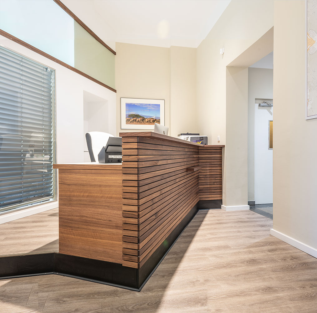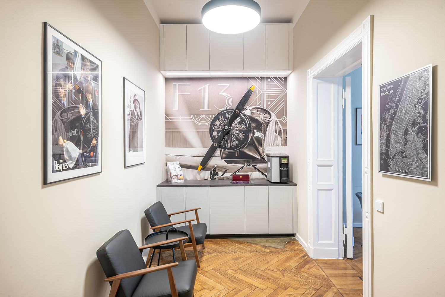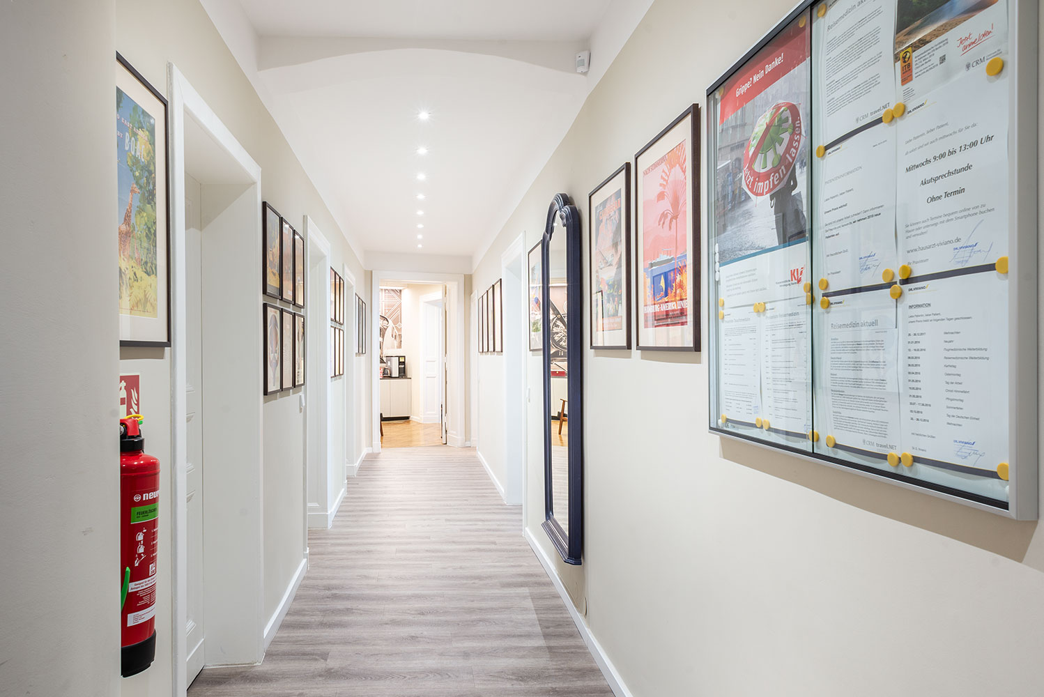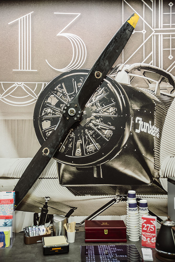 Werbeplakate von Fluggesellschaften der 50er und 60er Jahre vermitteln neben der Lust auf ferne Länder auch Mondänität, Weltoffenheit und Eleganz. Nach der Übernahme der alten Praxis für Allgemeinmedizin wollte der neue Betreiber mit einer Spezialisierung für Reisemedizin diese Atmosphäre auch in seine neuen Räume integrieren. Dafür wurde die gesamte Praxis umgebaut und neu gegliedert. Warme Holztöne beim Bodenbelag harmonieren mit sandfarben abgetönten Wänden. Die oben beschriebenen Werbeplakate wurden dunkel gerahmt und erzeugen gemeinsam mit einer Kombination von historischen und modernen Möbeln eine wohnliche Atmosphäre. Besonders beindruckend ist der originale Propeller eines historischen Flugzeugs oberhalb der Wasser- und Kaffeestation. Die kommunikative Loungemöblierung für Gäste und Patienten erinnert niemanden mehr an sterile Wartezimmer. Vielmehr lädt die vorhandene Reisebibliothek dazu ein, von den nächsten Fernzielen zu träumen.