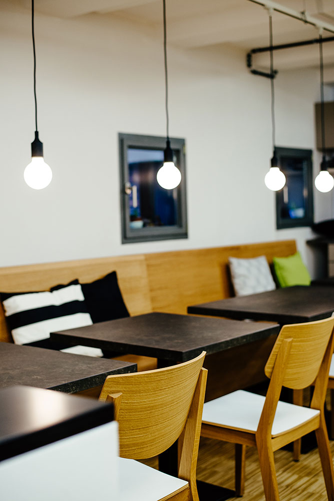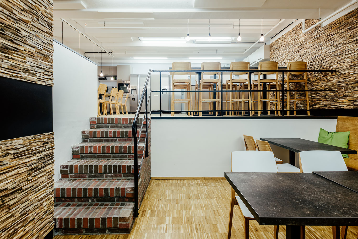 Besonderer Wert wurde auf die Ausformung der Kommunikationsbereiche gelegt: Die Cafeteria wirkt trotz geringer Raumhöhe einladend und großzügig. Informelle Besprechungssituationen wurden mittels Sitznischen und Stehtischen mit Monitor geschaffen. Die Konferenzräume sind unterschiedlich möbliert, aber immer durch eine Holzpaneelwand mit Monitor erkennbar. Alle Elemente finden sich zudem im wichtigsten Bereich der Begegnung und Kommunikation wieder – der Empfang wirkt identitätsstiftend und heißt Mitarbeiter und Gäste willkommen.