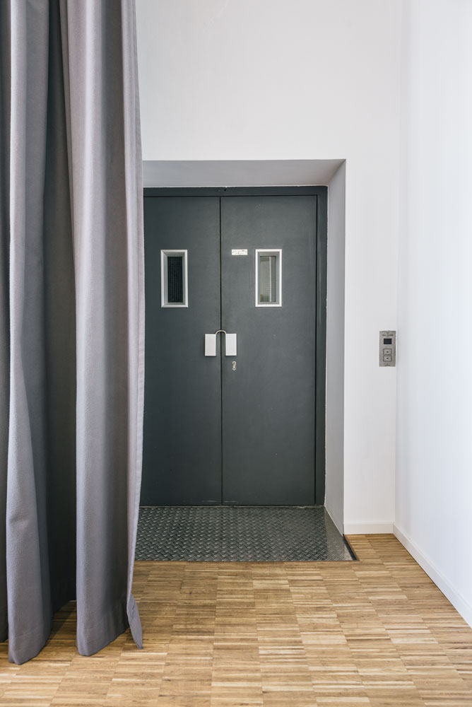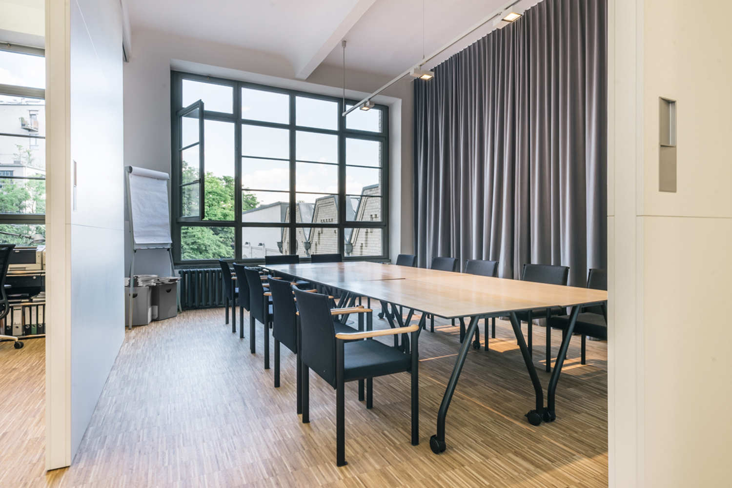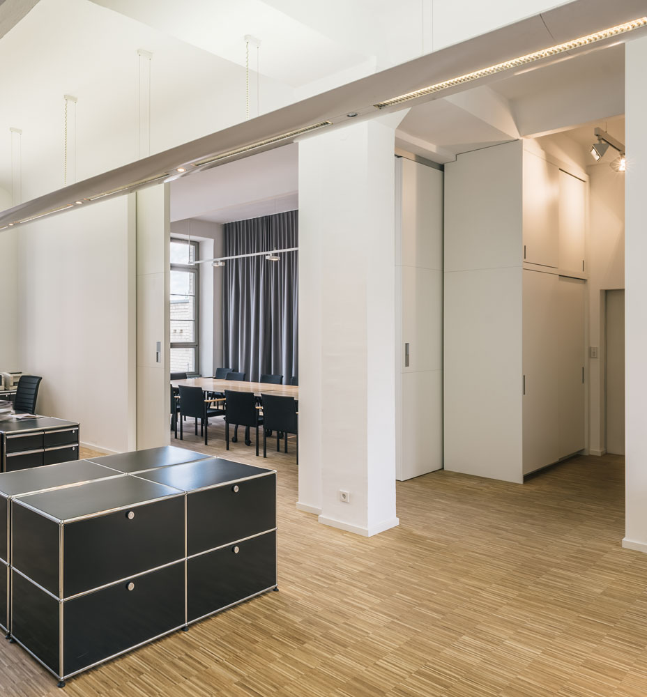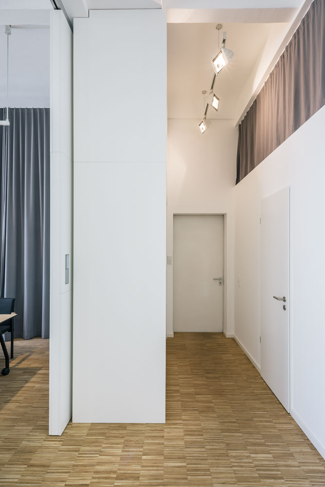 Eine weitere Anforderung war die Abtrennung eines Besprechungsraumes, ohne die Weite der Fläche zu sehr einzuschränken. Mittels zweier raumhoher Schiebetüren, die mit schallabsorbierenden Oberflächen auch die Raumakustik verbessern, kann ein Viertel des Büros über Eck geschlossen werden. Um die großen Mengen an Akten, Prospekten und Kisten zu verstauen, wurde eine Wand des Besprechungsbereiches mit einem Vorhang und einer dahinterliegenden offenen Regalkonstruktion versehen. Außerdem bietet ein deckenhoher Schiebetürenschrank im Eingangsflur Stauraum und Platz für die Garderobe. Über dem Sanitärkern wurde eine begehbare Decke ausgebildet, so dass hier ebenfalls Lagermöglichkeiten bestehen.