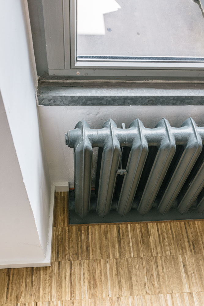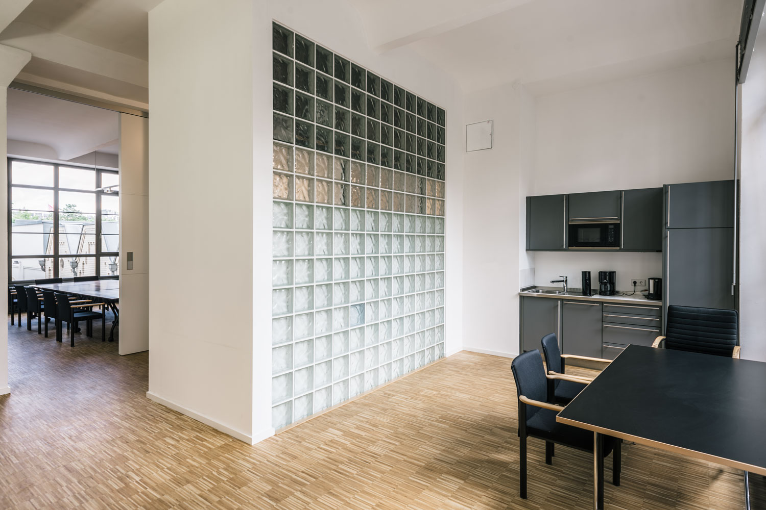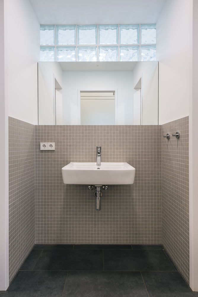 In der 140 Quadratmeter großen, offenen Bürofläche wurden dringend eigene Toiletten benötigt. Der Sanitärkern wurde an eine vorhandene Glasbausteinwand angeschlossen, so dass die innenliegenden WC-Räume von der natürlichen Belichtung profitieren. Im Zuge dieser notwendigen Umbaumaßnahmen konnte auch die Raumnutzung neu definiert und die Gestaltung überarbeitet werden. Der Industriecharme der Fläche wird nun durch den Einsatz von klaren Farben und wenigen robusten Materialien unterstrichen, z.B. ersetzt Echtholz-Industrieparkett den vorherigen wildgemusterten Teppichboden. Schwarz, Weiß und Grau sowie Holztöne in Möbeln und Boden lassen die Räume großzügig wirken und entsprechen dem architektonischen Selbstverständnis des Nutzers.