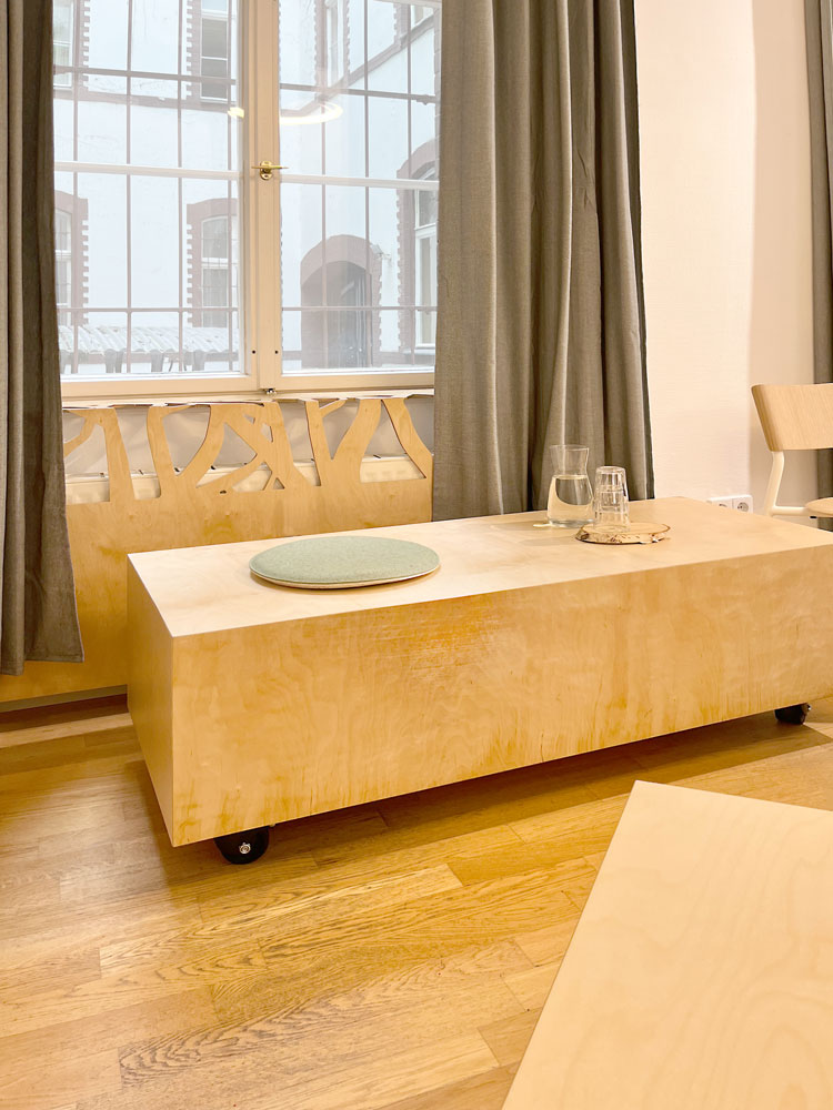 Im großen Besprechungsraum können Tische, Sitzmöbel und Arena bewegt und verändert werden, so dass Workshops, Konferenzen und Abendveranstaltungen flexibel möglich sind.