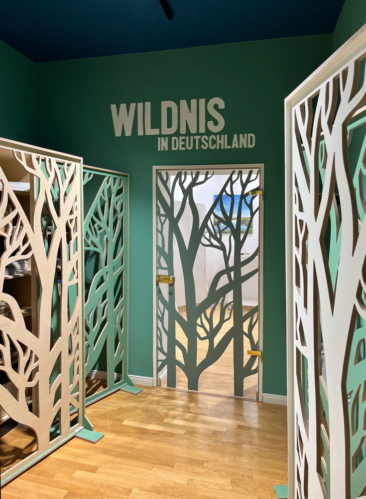 Es galt, das Thema Natur und Wildnis in die Räume zu bringen und dabei in der Produktauswahl Nachhaltigkeitsaspekte budgetorientiert umzusetzen. Corporate Design-Farben verweisen u.a. auf die Webseite „Wildnis in Deutschland“ und die Projektpartner. Helles Holz, Linoleum-Schreibtische und viele Pflanzen erzeugen eine biophile Wohlfühlatmosphäre.