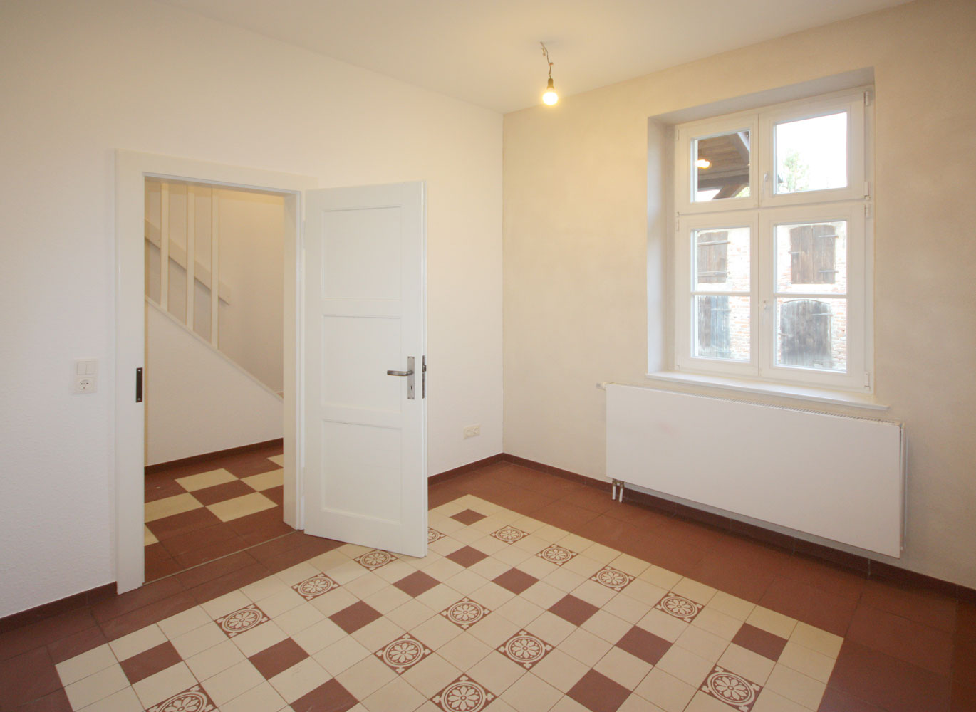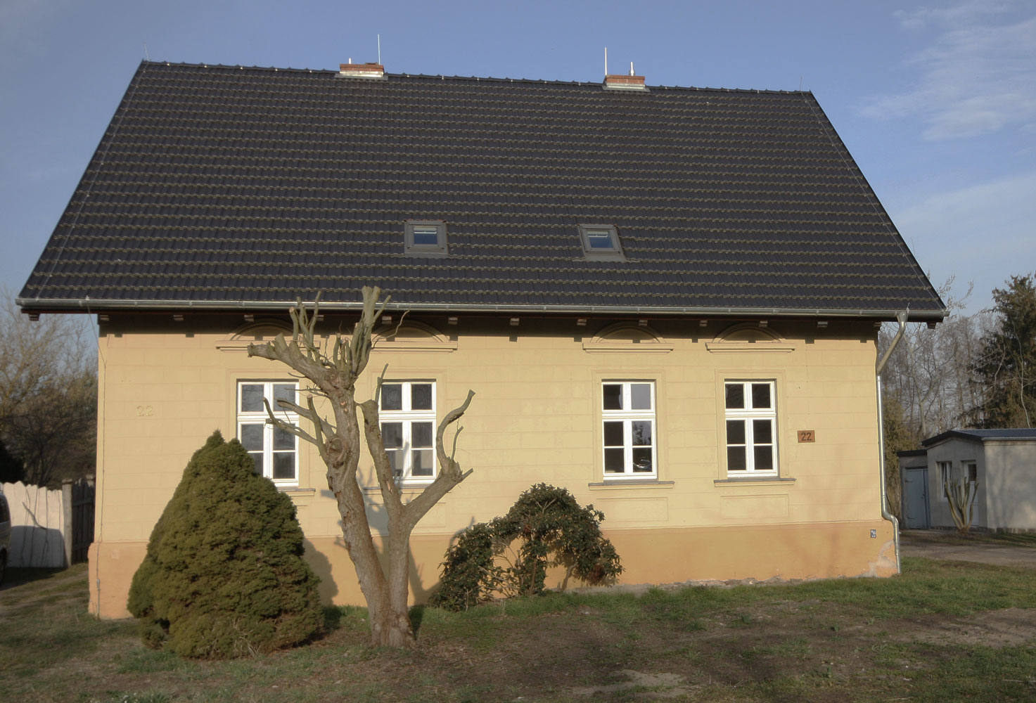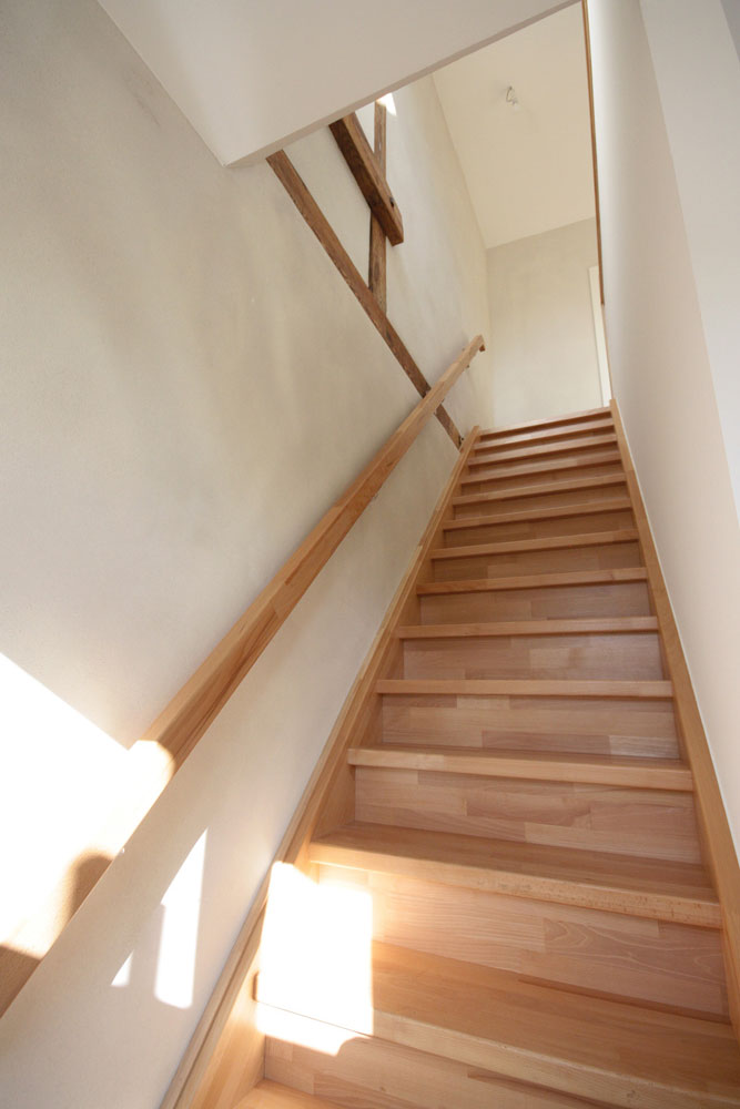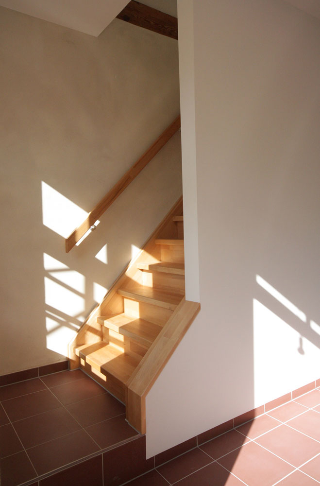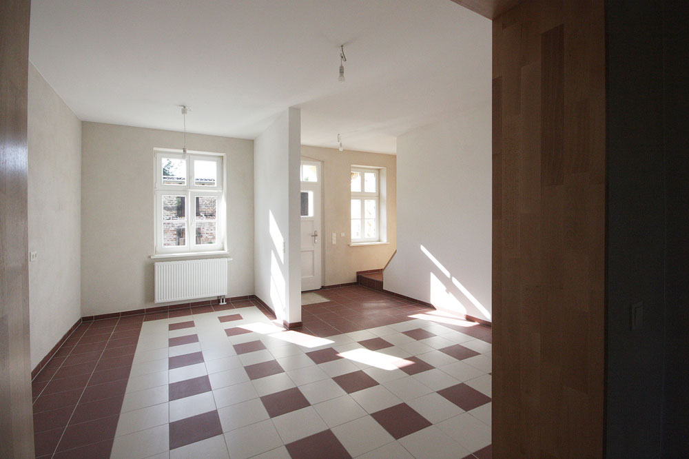 Das Doppelhaus stammt aus den 1920er Jahren und gehört zu einem Gutshof-Ensemble. Schrittweise wurden Hülle und Wohneinheiten saniert. Das Dach wurde neu gedeckt und Dachfenster ergänzt. Das Innere ist neu strukturiert; einige alte Türen und eine der Treppen wurden dabei erhalten. Neue Türen wurden stilistisch passend ergänzt. Die historischen Stützbalken und Fachwerkelemente wurden geschliffen und geölt. Der Innenausbau folgt einem Gesamtgestaltungskonzept, das neuen Trockenbau, naturbelassenen Kalkputz, rot-weiße und blaue-weiße Musterfliesen aus der Region sowie neue und alte Holzelemente in beiden Wohneinheiten übergreifend anwendet. Die Bäder – jeweils ein größeres Duschbad im Obergeschoss und ein WC mit Waschmaschinenanschluss im Erdgeschoss – sind neu konzipiert.