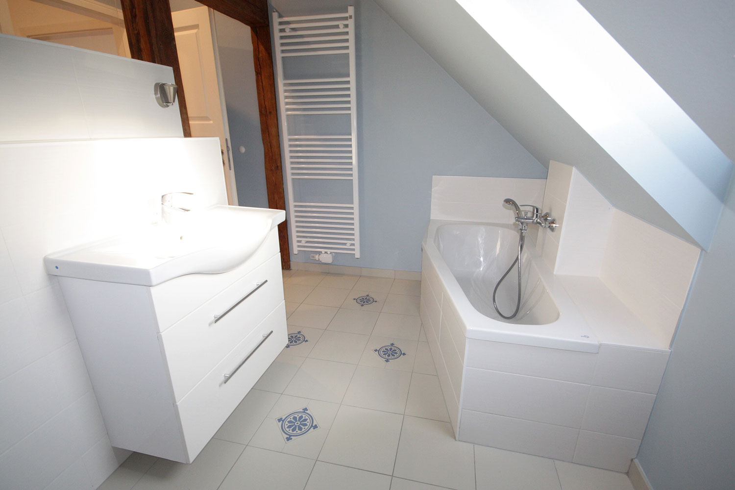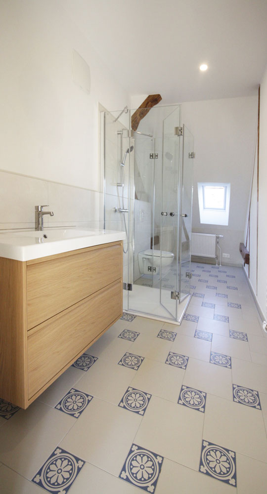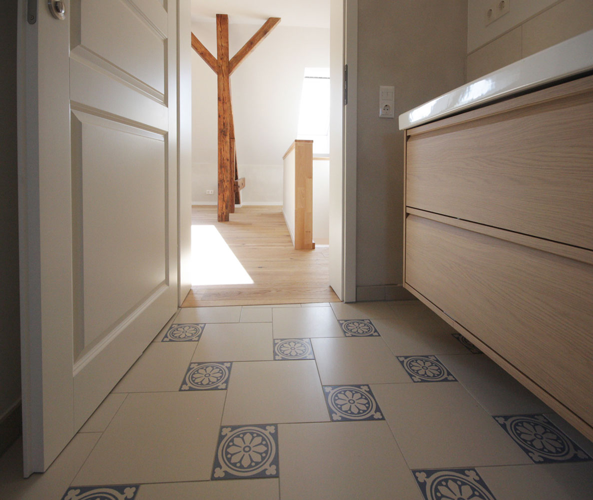 Die Fliesenanordnung wurde minutiös geplant, denn hier kamen Restposten in kleinen Stückzahlen und verschiedenen Formaten zum Einsatz. Das erforderte besondere Kreativität bei der Planung und erfahrene Handwerkskunst auf Seiten des Fliesenlegers.