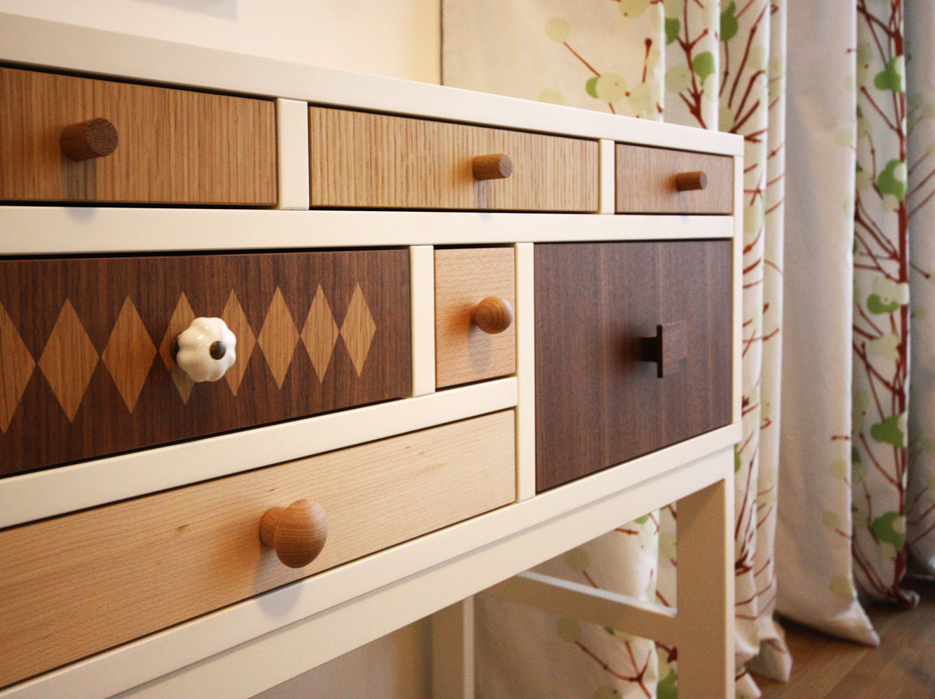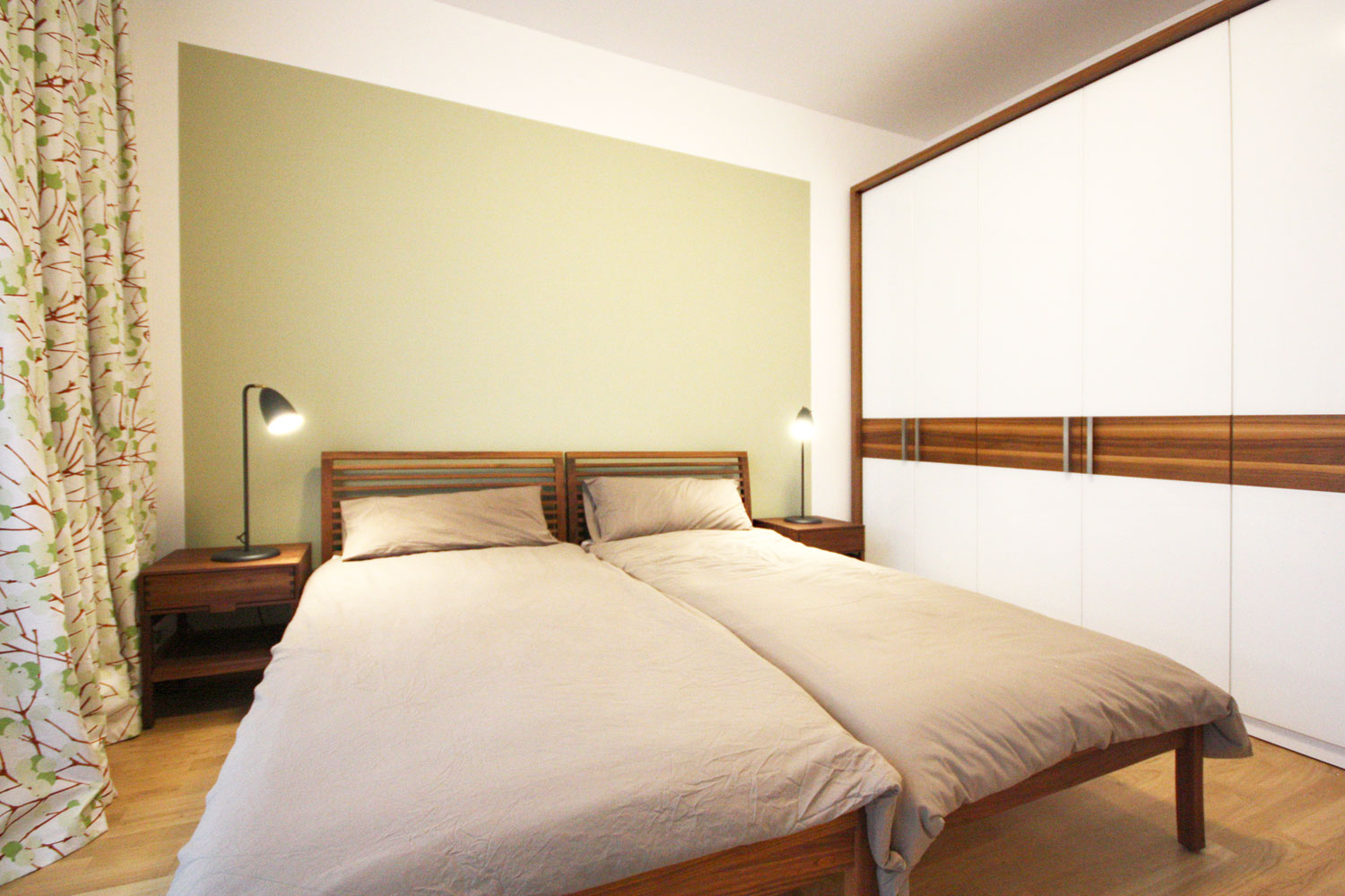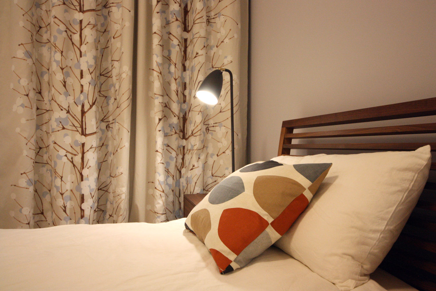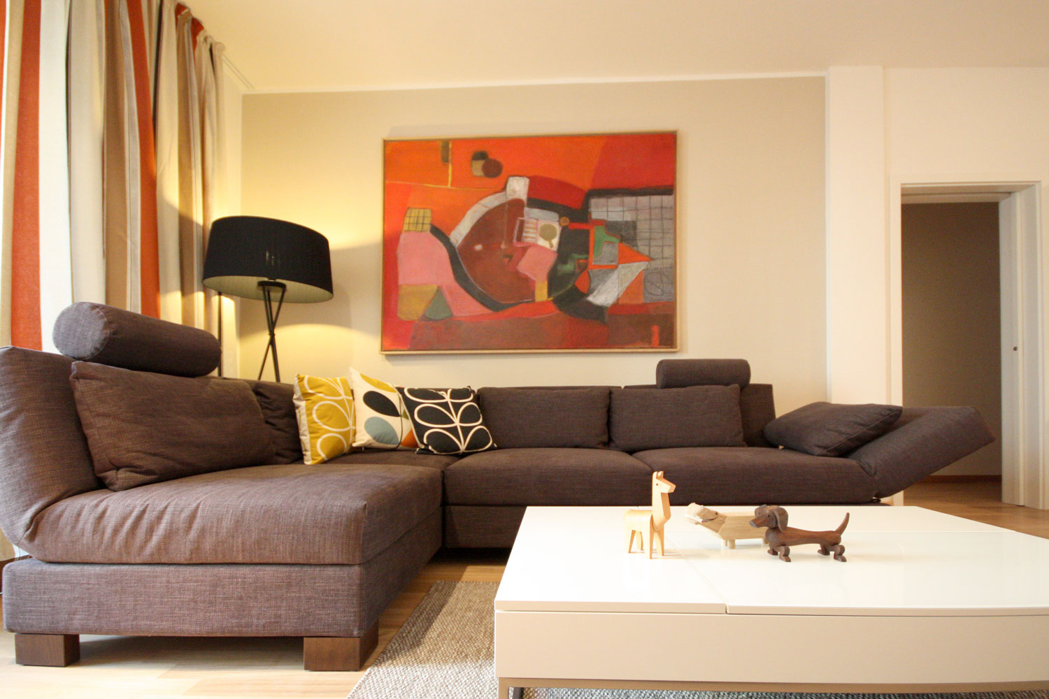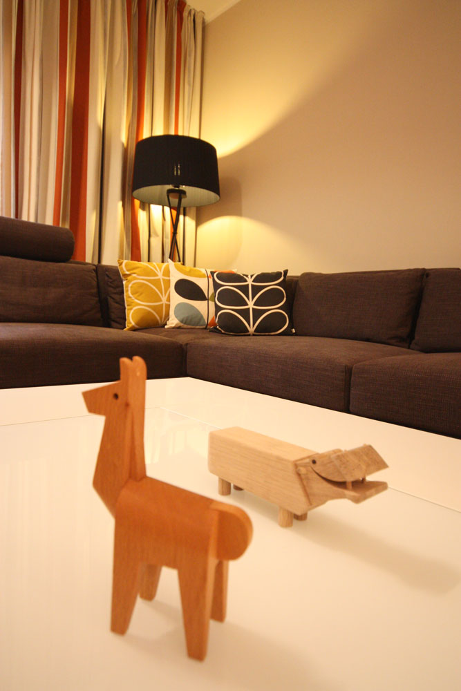 Für diese Wohnung in einem Investorenneubau entwickelten wir ein Gesamtgestaltungskonzept für Möblierung, Wandfarben, Beleuchtung und Verschattung. Einen großen Anteil an der Möblierung haben skandinavische Produkte, insbesondere die Wohntextilien mit fröhlichen Dekoren.