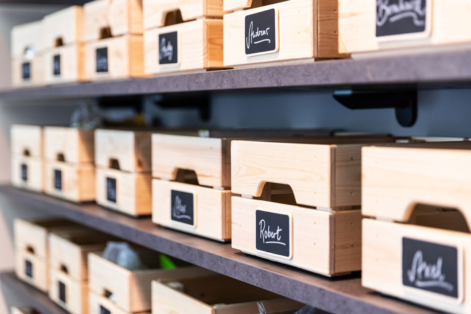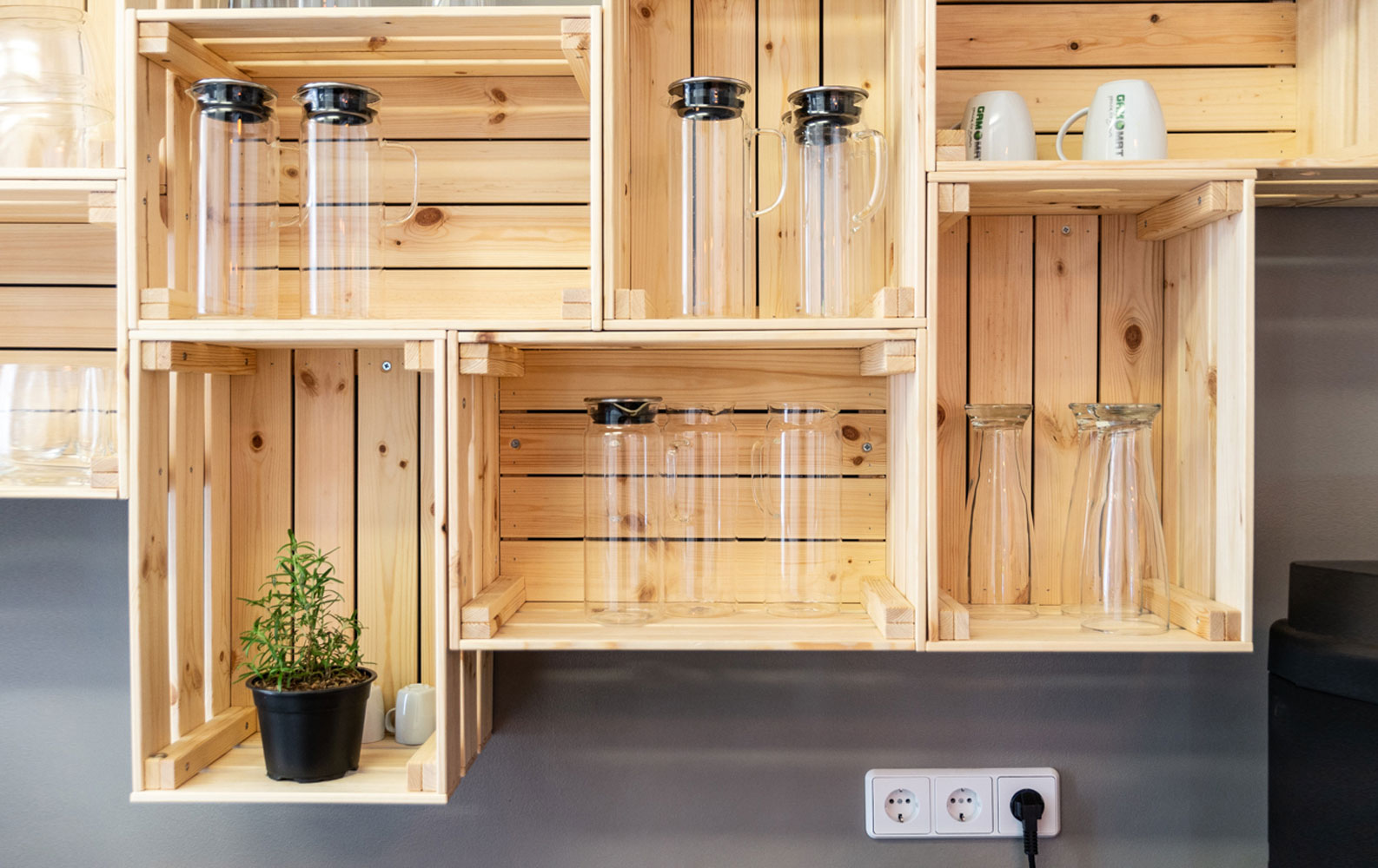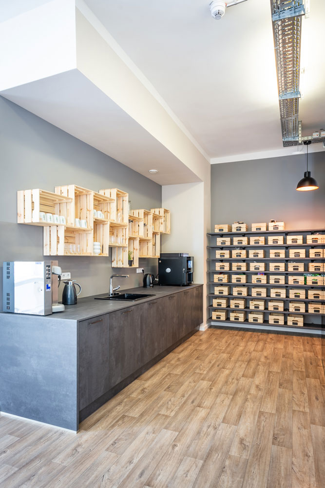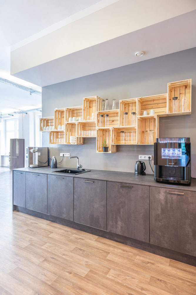 Zentraler Treffpunkt ist die im Durchgang gelegene große Küche mit angrenzender Gemeinschaftsfläche. Genügend Stauraum und Arbeitsfläche mit graphitfarbenen Oberflächen erzeugen zusammen mit dem Boden in Holzoptik eine rustikale Atmosphäre. Offene Holzkisten und kleinere Boxen bieten Platz für Gläser, Tassen und persönliche Vorräte. Hier trifft man sich zum morgendlichen Kaffee genauso wie mittags zum Essen. Auch für Vorträge oder Abendveranstaltungen ist genug Platz.