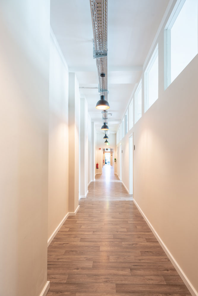 Der Gestaltungsfokus lag auf hellen Räumen mit leicht industriellem Erscheinungsbild. Große Oberlichter zwischen Fluren und Büros lassen Tageslicht in die Gänge, ein freundliches Hellbeige an den Wänden ist kombiniert mit einzelnen Wandflächen in Betonoptik. Industrieleuchten, offen geführte Leitungen und Kabeltrassen sowie die Substanz des Altbaus unterstützen den Werkstattcharakter.